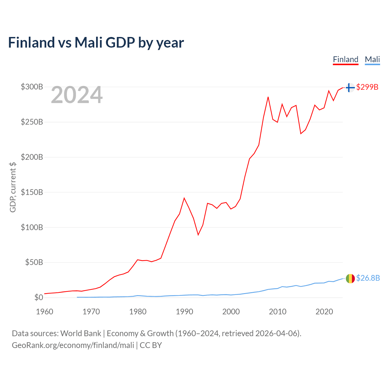 Finland has a GDP of $299B compared to $26.8B for Mali, ranking 47/197 and 113/197 by economy size, respectively.