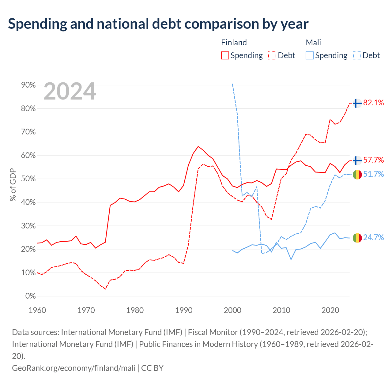 Finland has $245B in government debt (82.1% of GDP), compared to $13.9B (51.7% of GDP) in Mali.