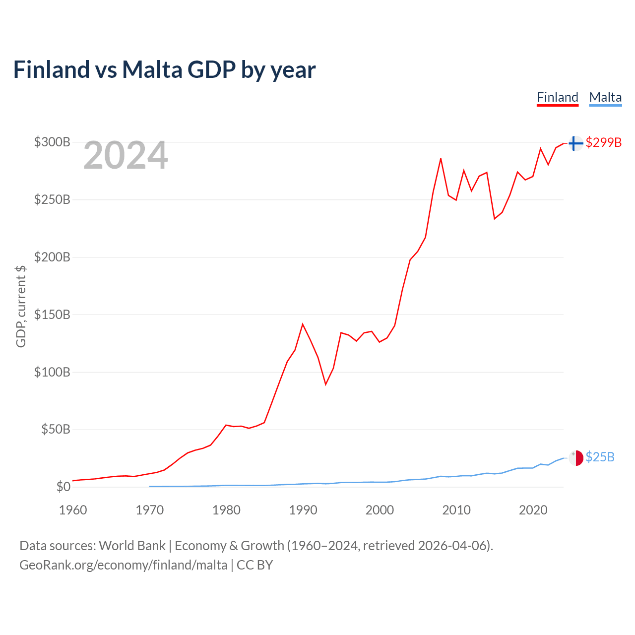 Finland has a GDP of $299B compared to $25B for Malta, ranking 47/197 and 119/197 by economy size, respectively.