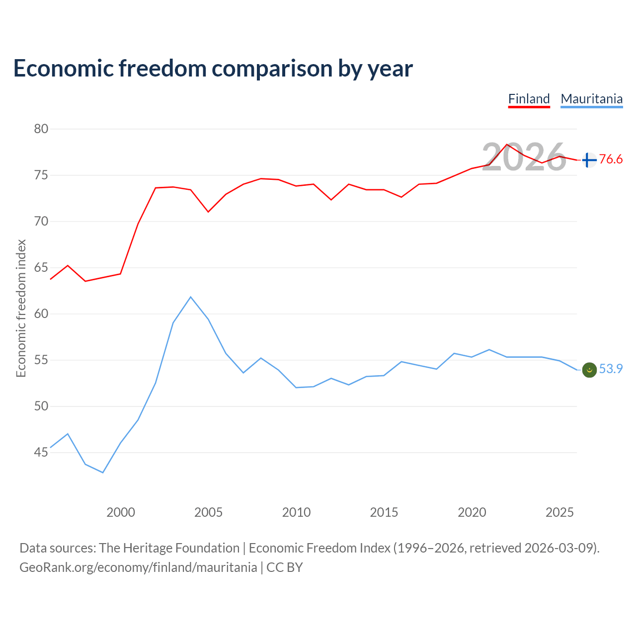 The Economic Freedom Index for Finland is 76.6, ranking 15/197, compared to 53.9 for Mauritania, ranking 136/197. The chart above displays a comparison of annual changes in economic freedom indexes.