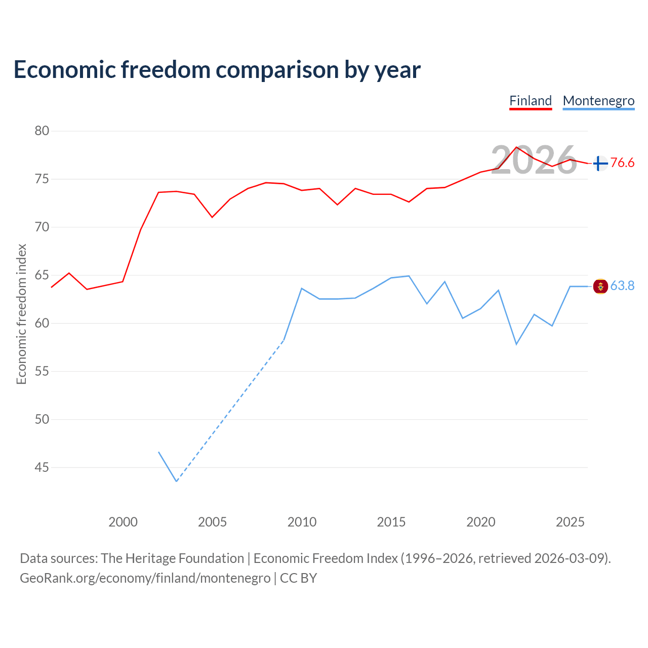 The Economic Freedom Index for Finland is 76.6, ranking 15/197, compared to 63.8 for Montenegro, ranking 78/197. The chart above displays a comparison of annual changes in economic freedom indexes.