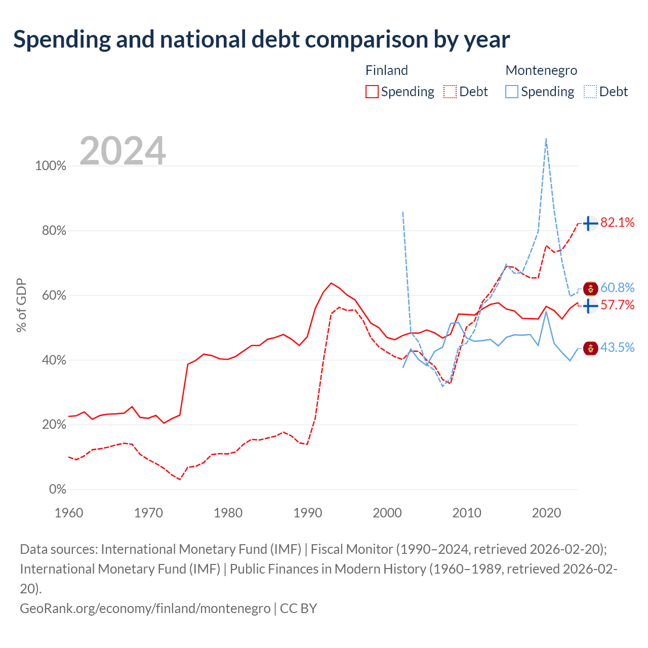 Finland has $245B in government debt (82.1% of GDP), compared to $5.02B (60.8% of GDP) in Montenegro.