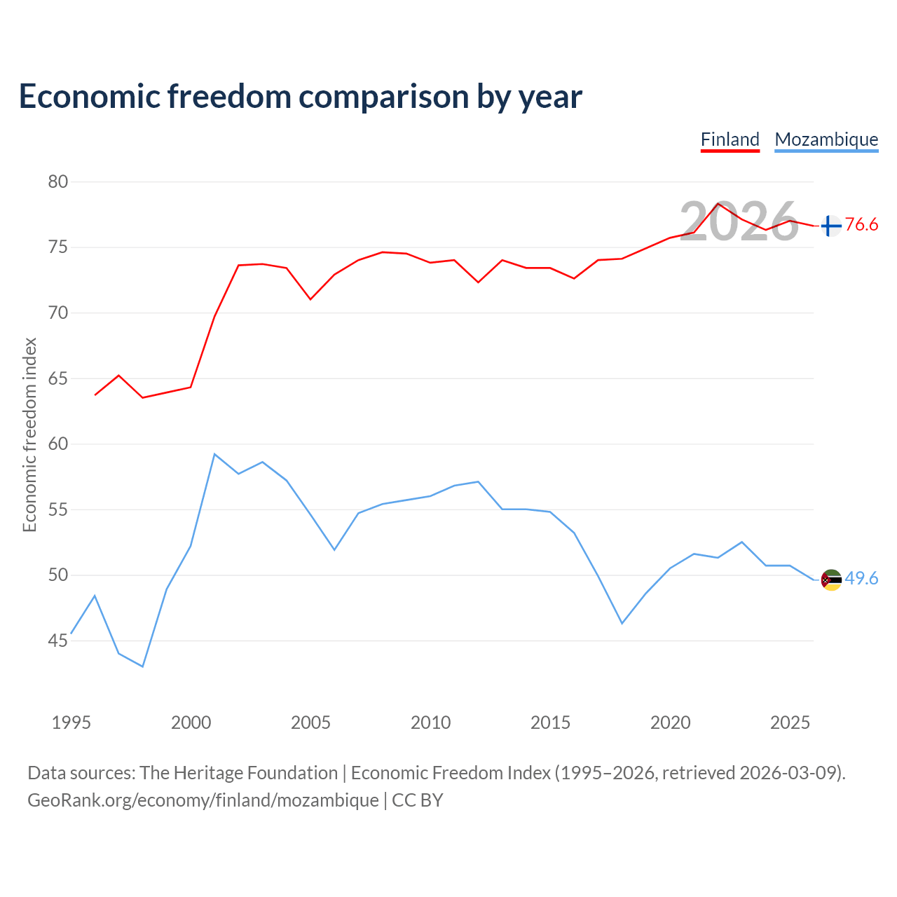 The Economic Freedom Index for Finland is 76.6, ranking 15/197, compared to 49.6 for Mozambique, ranking 164/197. The chart above displays a comparison of annual changes in economic freedom indexes.