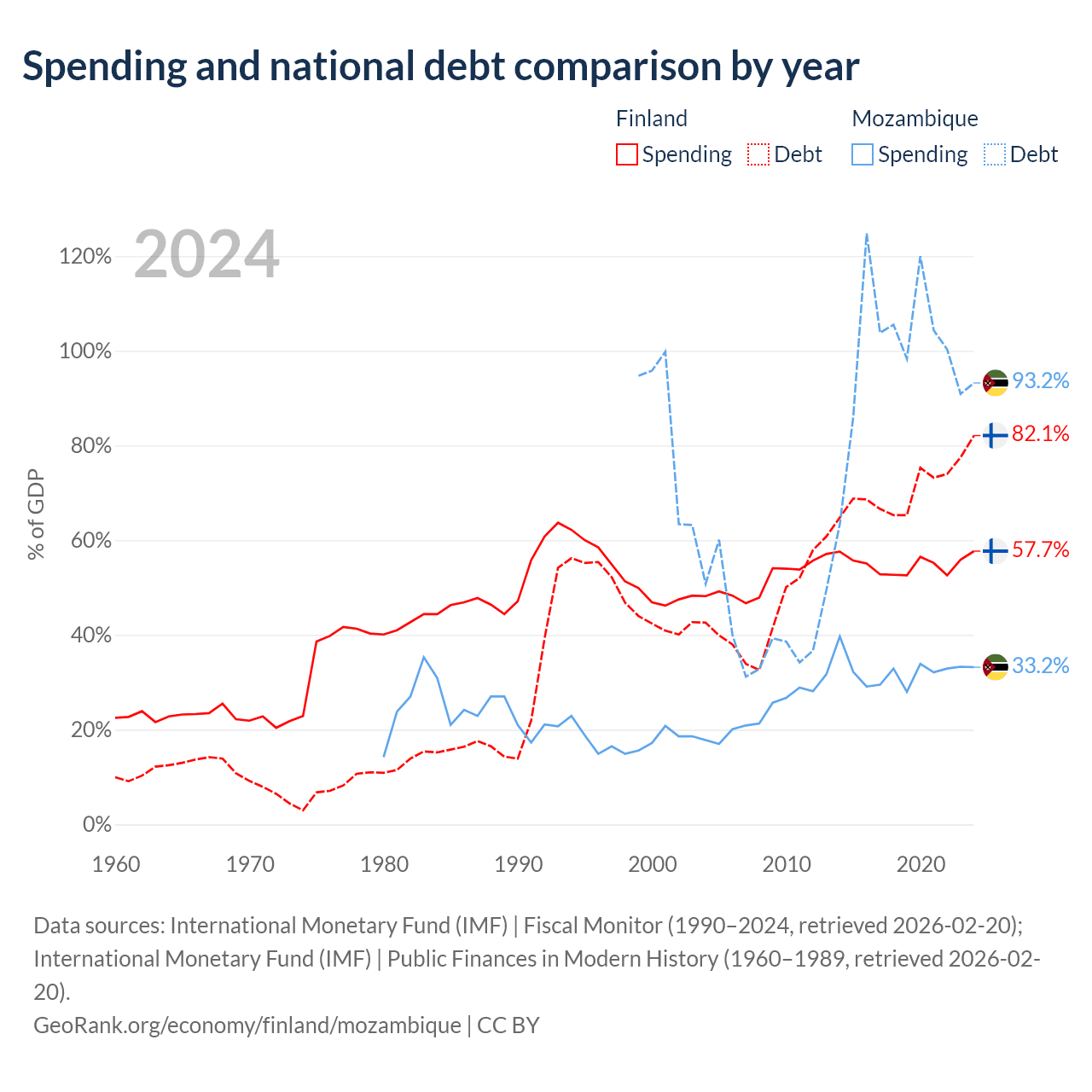 Finland has $245B in government debt (82.1% of GDP), compared to $21.2B (93.2% of GDP) in Mozambique.
