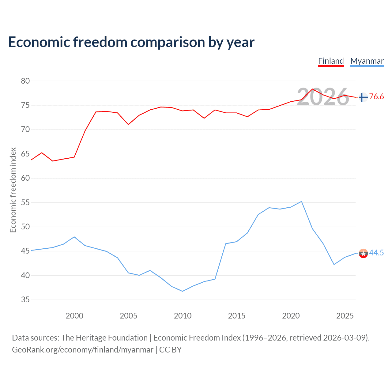 The Economic Freedom Index for Finland is 76.6, ranking 15/197, compared to 44.5 for Myanmar, ranking 180/197. The chart above displays a comparison of annual changes in economic freedom indexes.