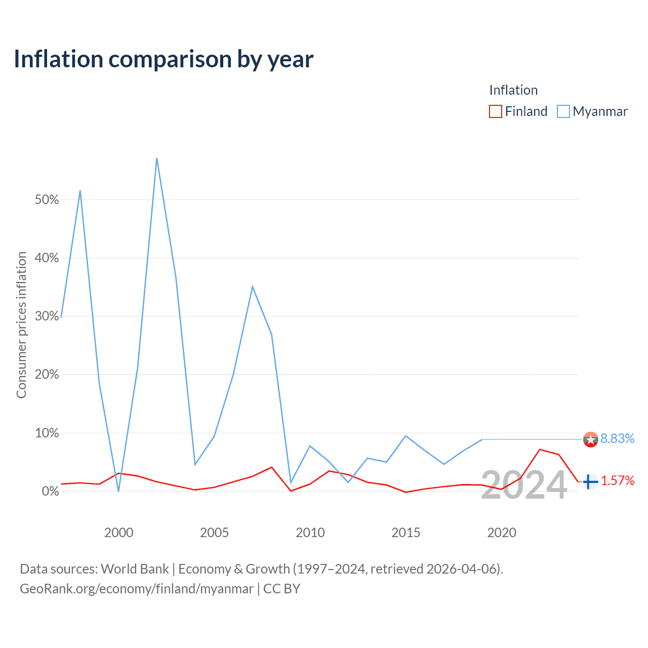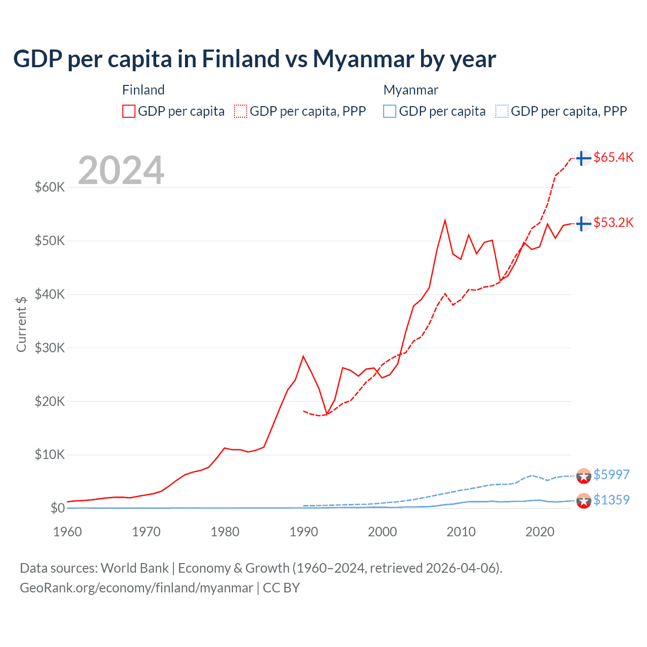 Finland has a GDP of $299B compared to $74.1B for Myanmar, ranking 47/197 and 85/197 by economy size, respectively.