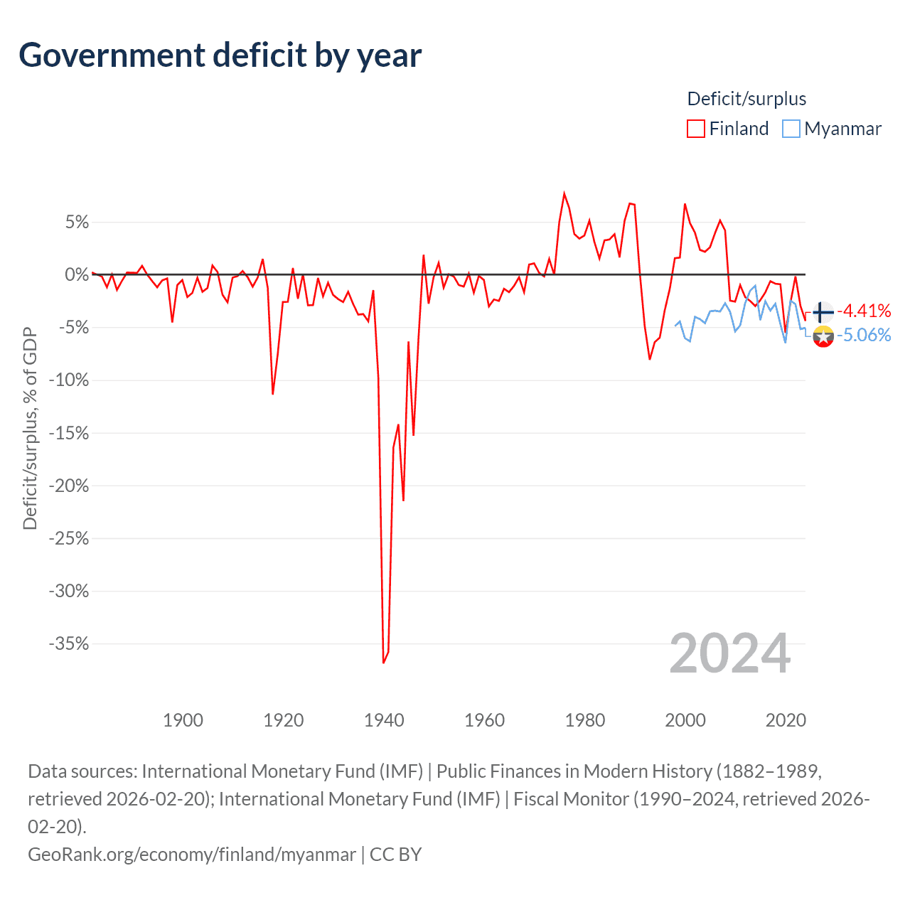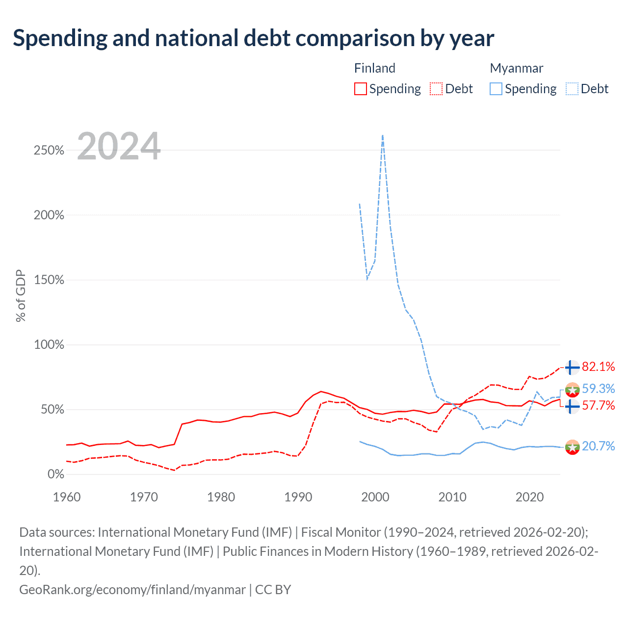 Finland has $245B in government debt (82.1% of GDP), compared to $44B (59.3% of GDP) in Myanmar.