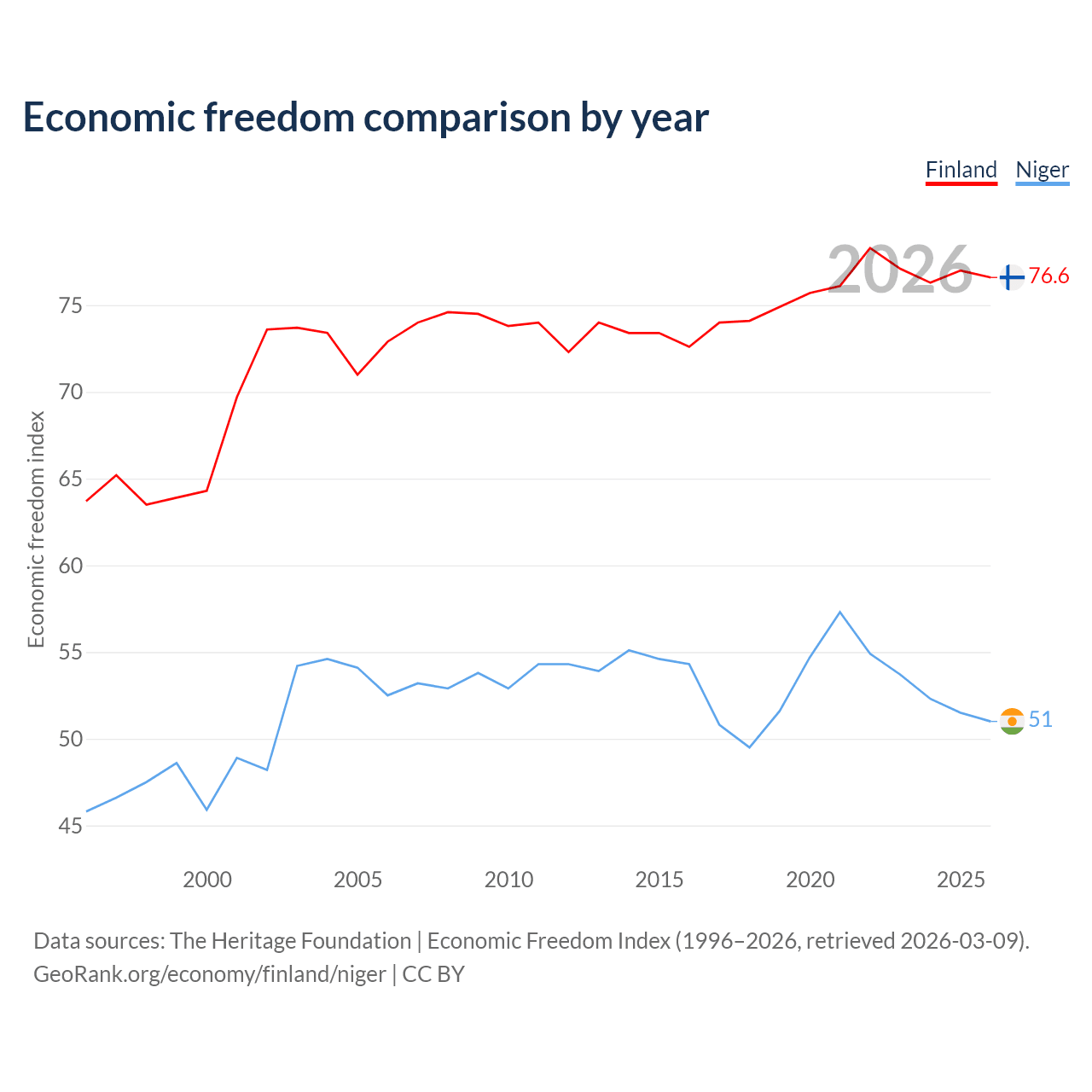 The Economic Freedom Index for Finland is 76.6, ranking 15/197, compared to 51 for Niger, ranking 156/197. The chart above displays a comparison of annual changes in economic freedom indexes.