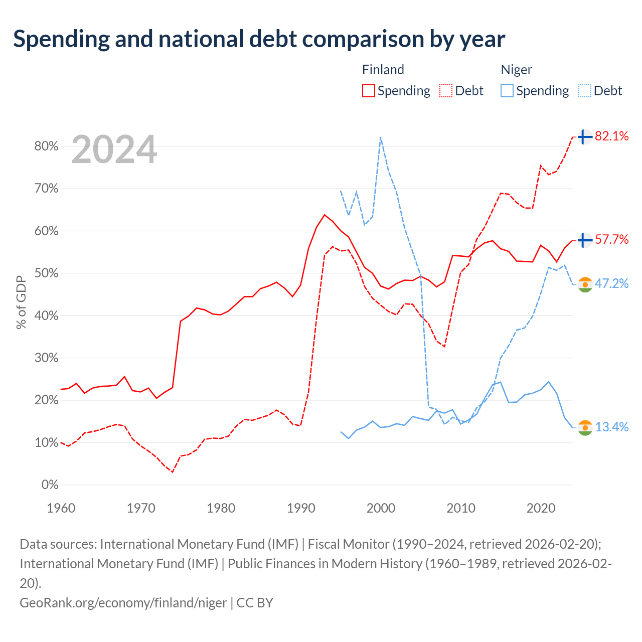 Finland has $245B in government debt (82.1% of GDP), compared to $9.39B (47.2% of GDP) in Niger.