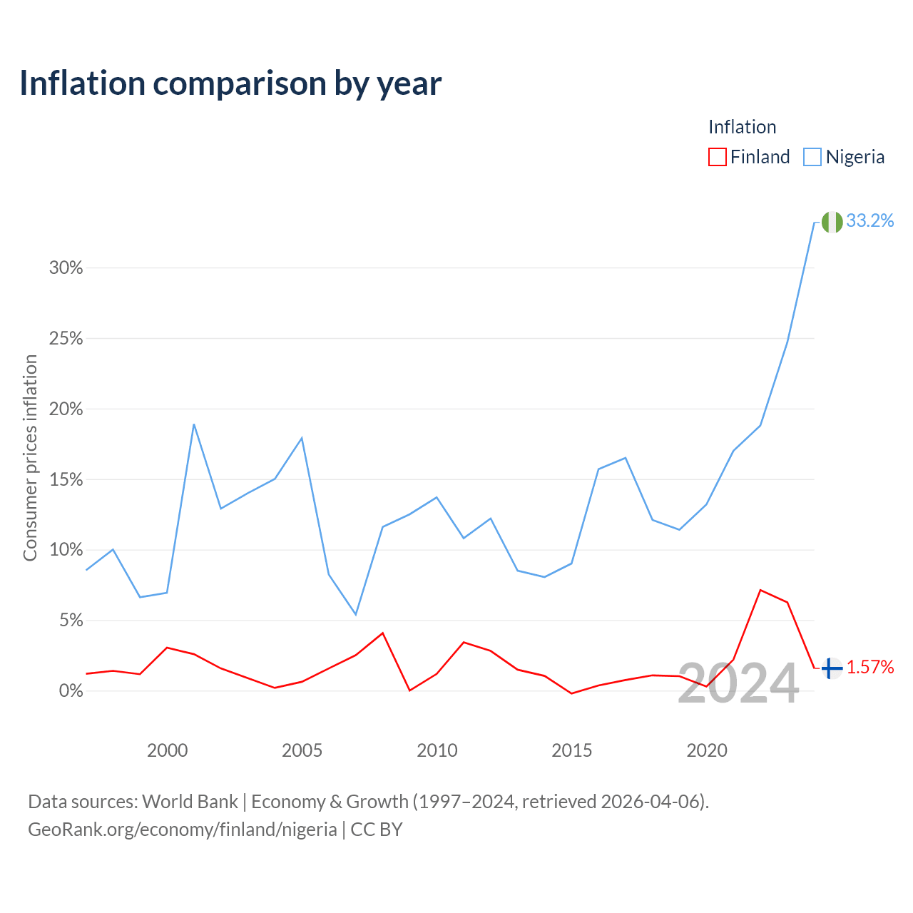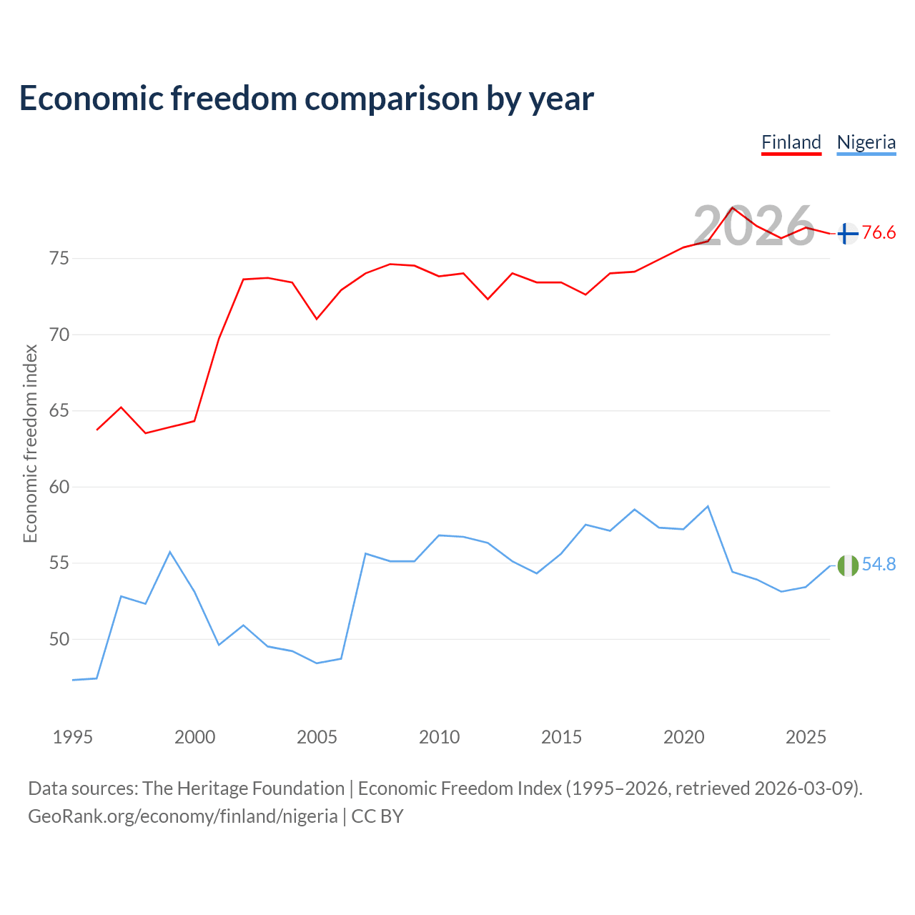 The Economic Freedom Index for Finland is 76.6, ranking 15/197, compared to 54.8 for Nigeria, ranking 132/197. The chart above displays a comparison of annual changes in economic freedom indexes.