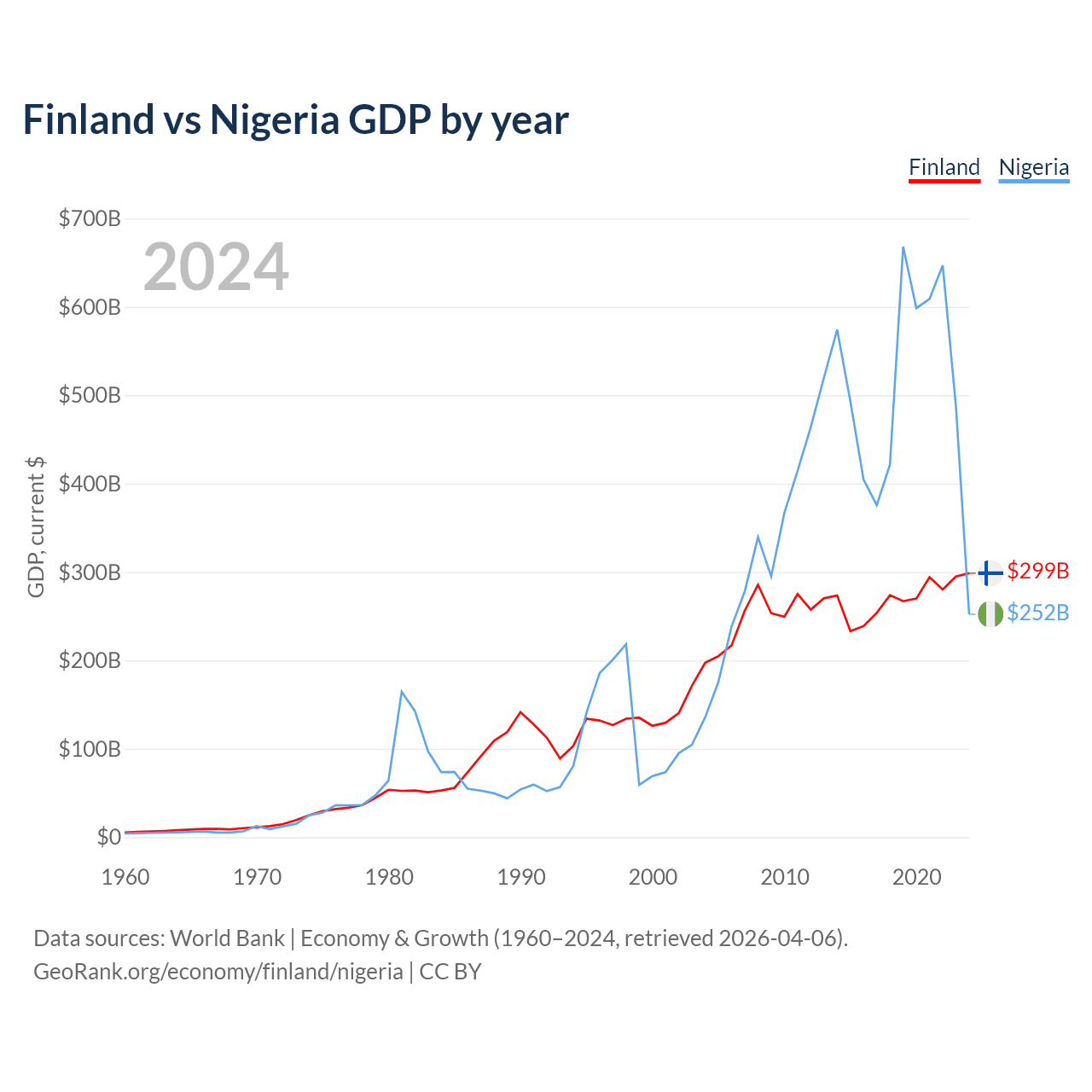 Finland has a GDP of $299B compared to $252B for Nigeria, ranking 47/197 and 54/197 by economy size, respectively.