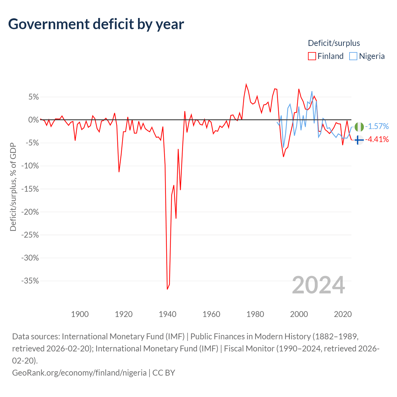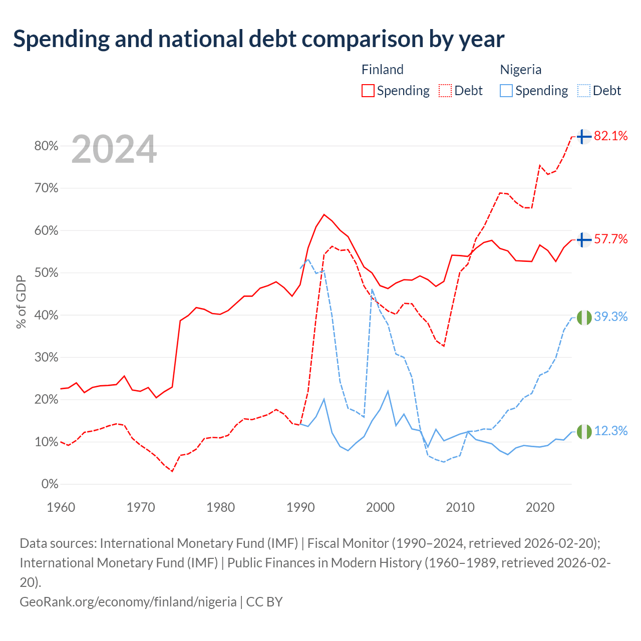 Finland has $245B in government debt (82.1% of GDP), compared to $99.2B (39.3% of GDP) in Nigeria.
