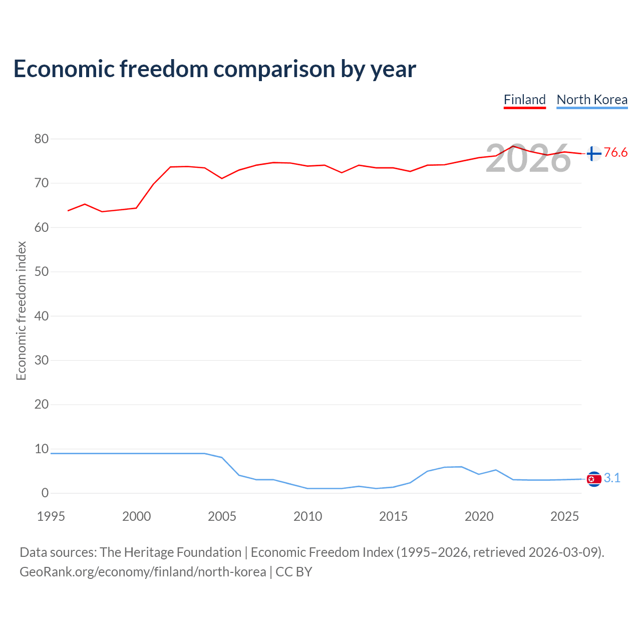 The Economic Freedom Index for Finland is 76.6, ranking 15/197, compared to 3.1 for North Korea, ranking 197/197. The chart above displays a comparison of annual changes in economic freedom indexes.