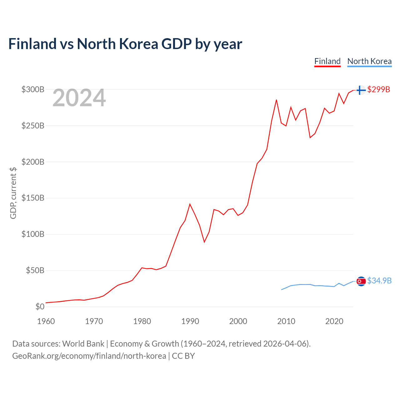 Finland has a GDP of $299B compared to $34.9B for North Korea, ranking 47/197 and 106/197 by economy size, respectively.