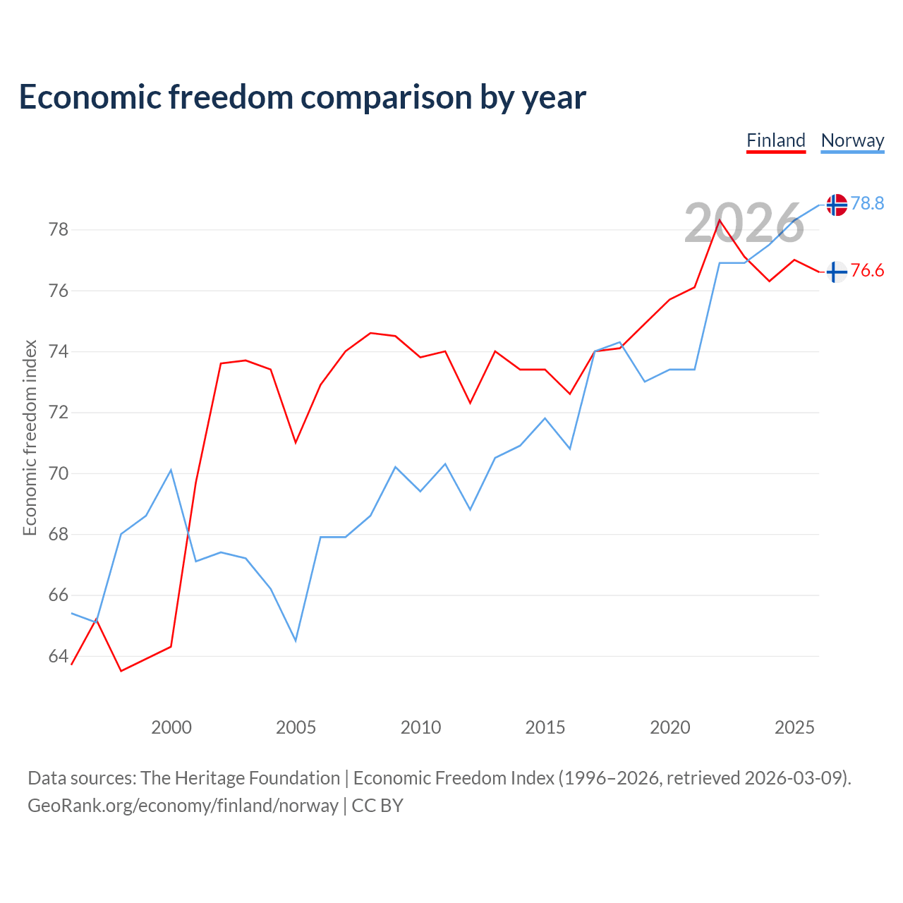 The Economic Freedom Index for Finland is 76.6, ranking 15/197, compared to 78.8 for Norway, ranking 9/197. The chart above displays a comparison of annual changes in economic freedom indexes.