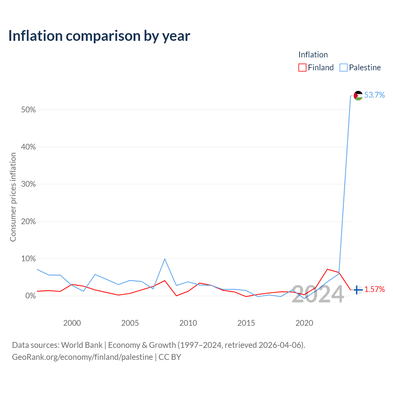 Finland has a GDP of $299B compared to $13.7B for Palestine, ranking 47/197 and 146/197 by economy size, respectively.