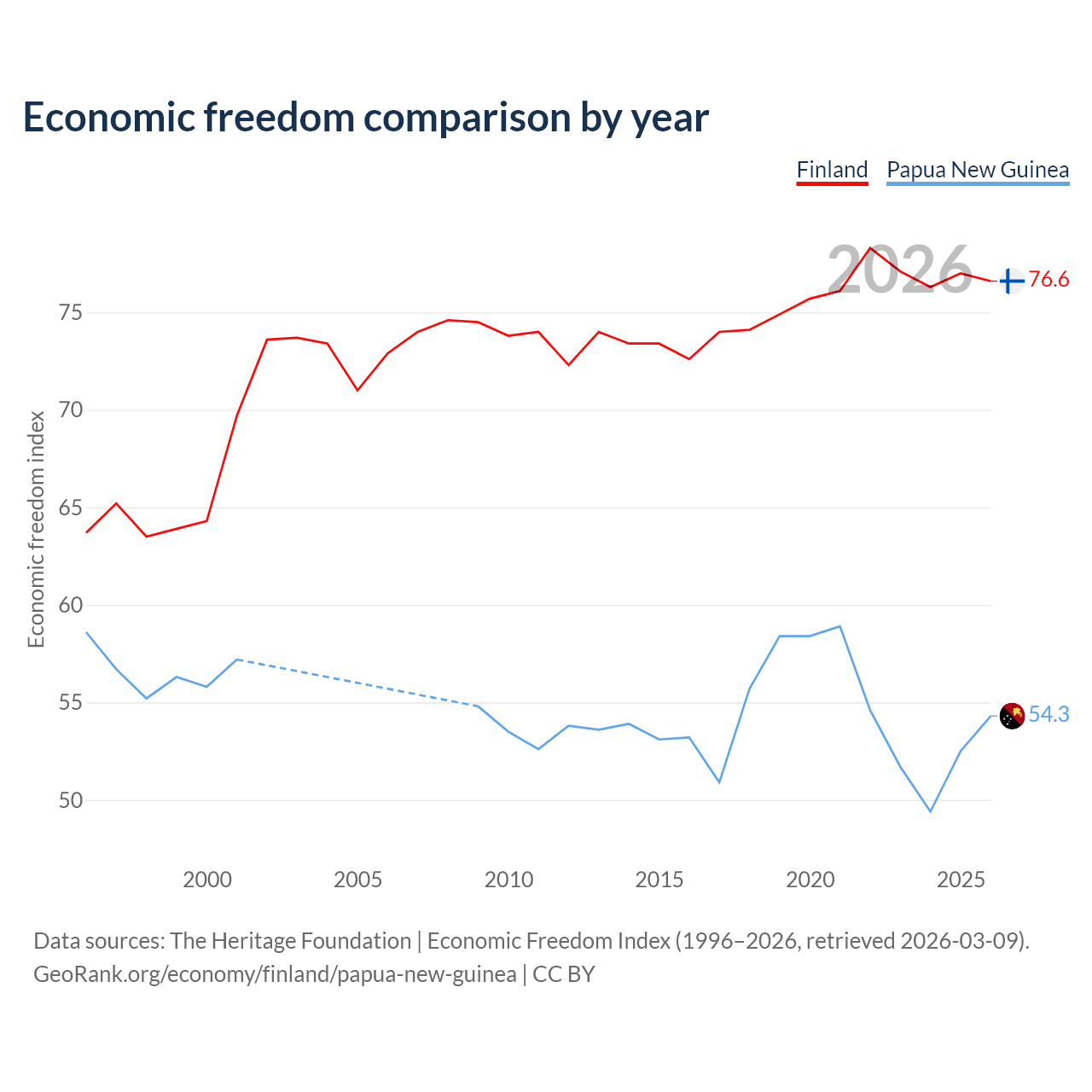 The Economic Freedom Index for Finland is 76.6, ranking 15/197, compared to 54.3 for Papua New Guinea, ranking 134/197. The chart above displays a comparison of annual changes in economic freedom indexes.