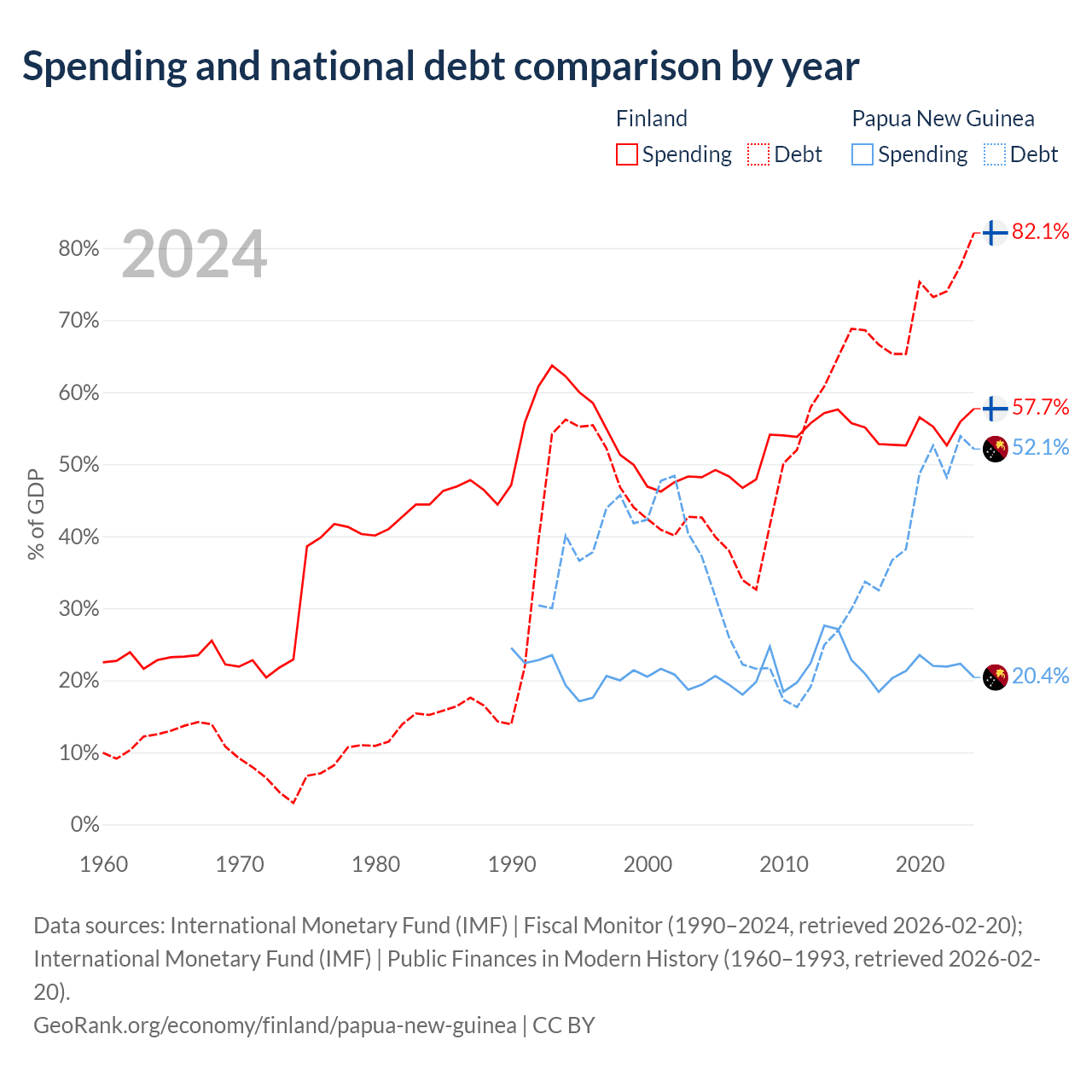 Finland has $245B in government debt (82.1% of GDP), compared to $16.6B (52.1% of GDP) in Papua New Guinea.