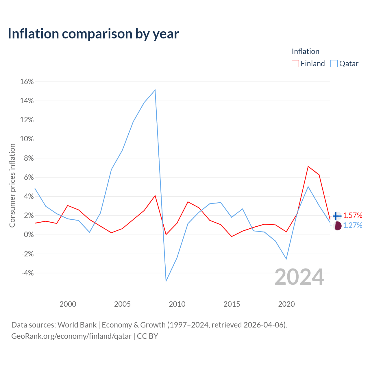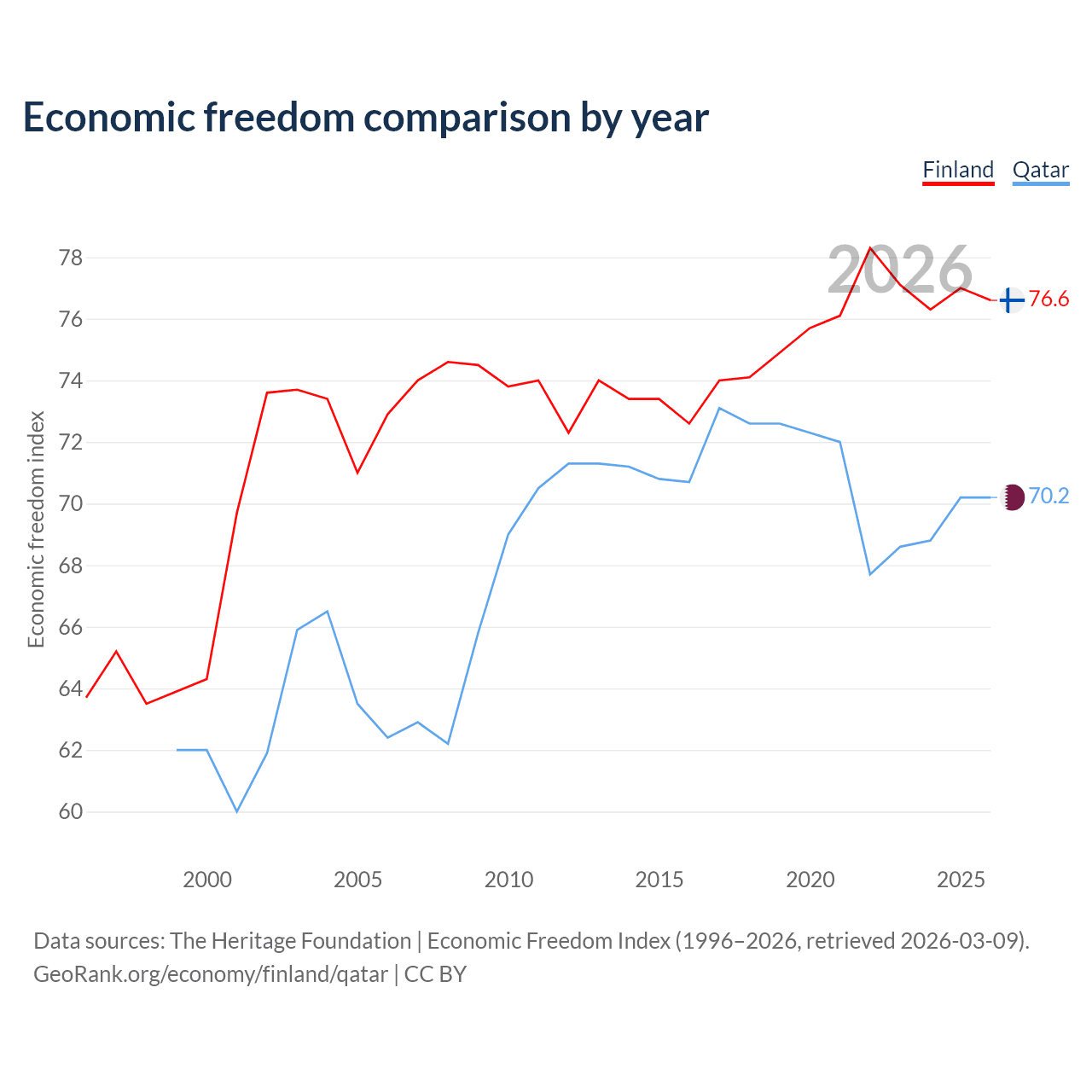 The Economic Freedom Index for Finland is 76.6, ranking 15/197, compared to 70.2 for Qatar, ranking 37/197. The chart above displays a comparison of annual changes in economic freedom indexes.