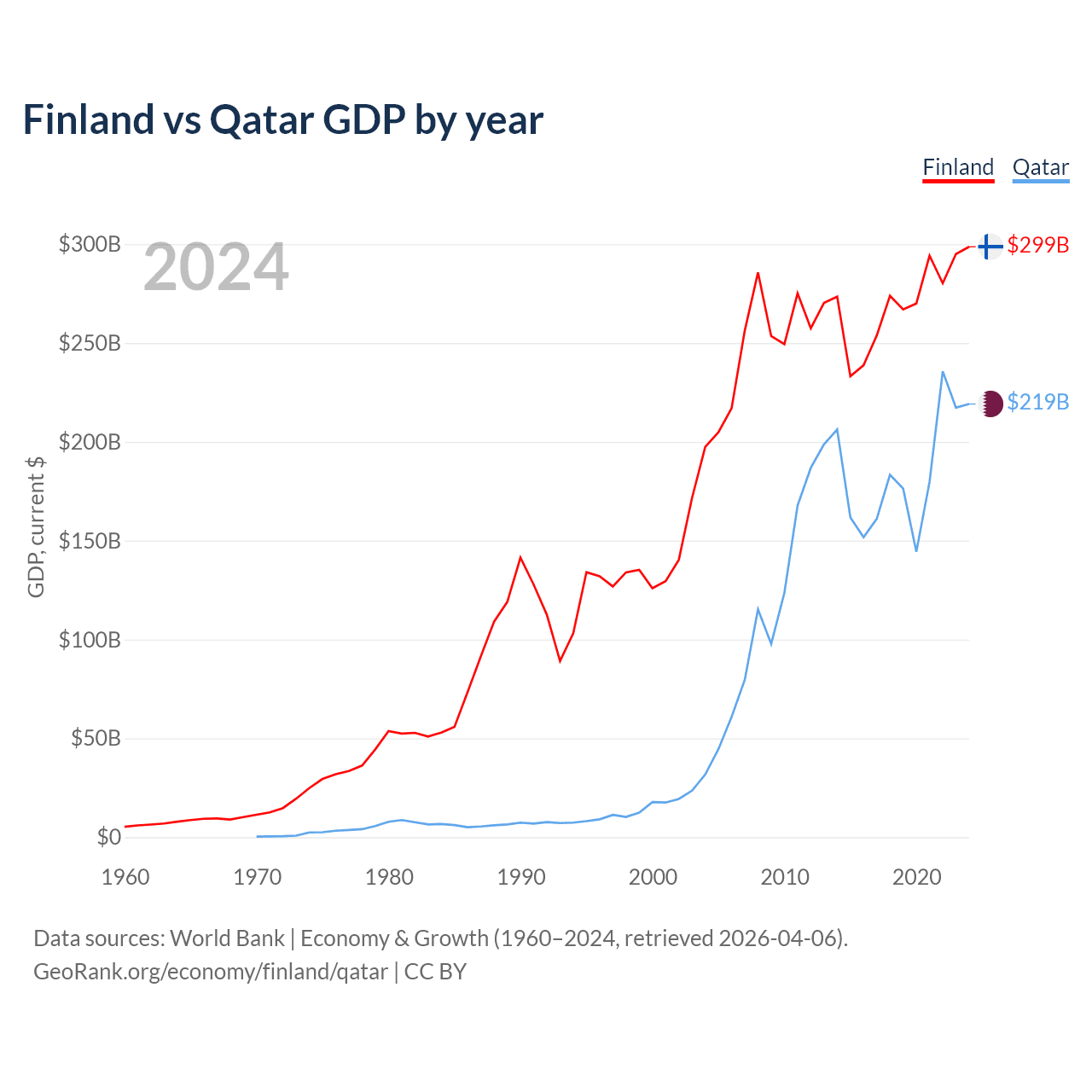 Finland has a GDP of $299B compared to $219B for Qatar, ranking 47/197 and 56/197 by economy size, respectively.
