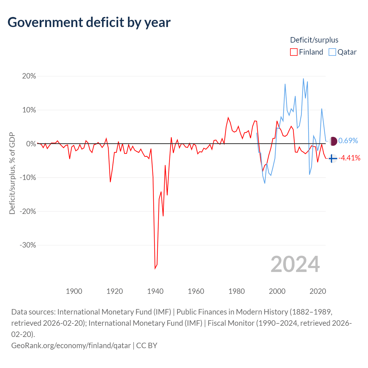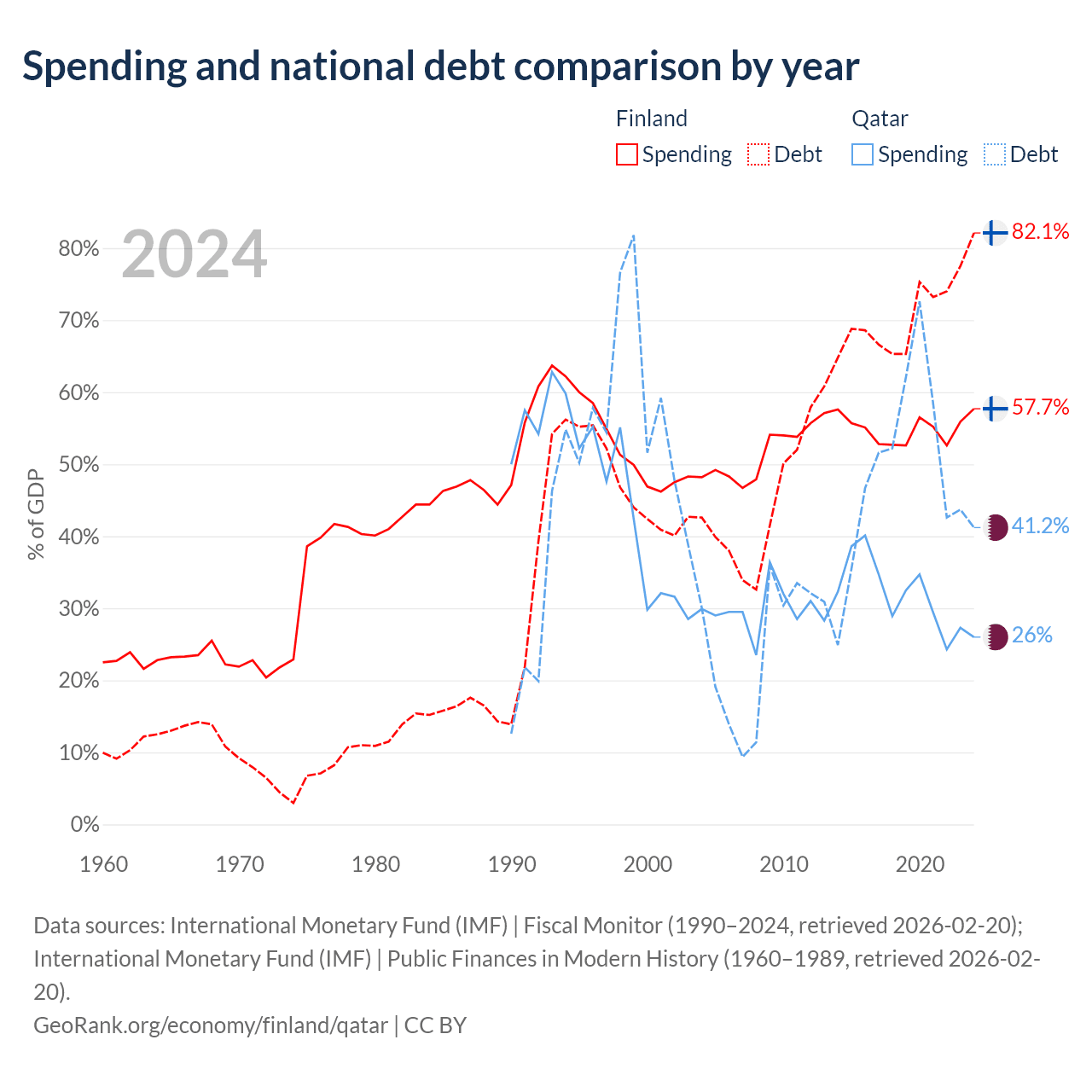 Finland has $245B in government debt (82.1% of GDP), compared to $90.2B (41.2% of GDP) in Qatar.
