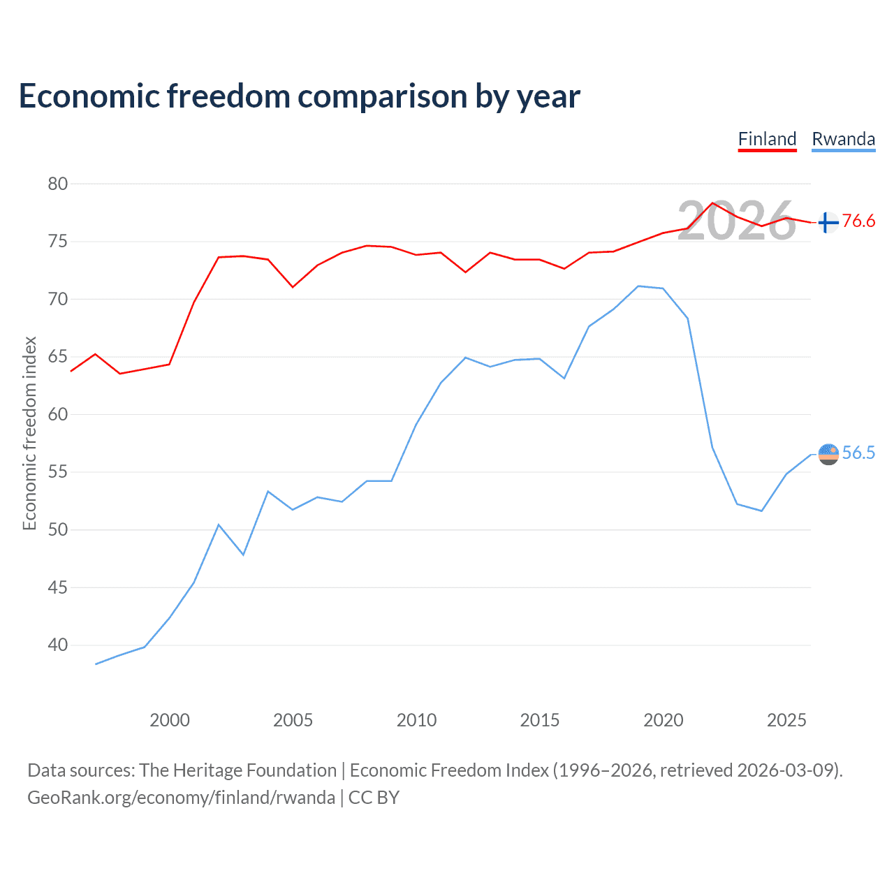 The Economic Freedom Index for Finland is 76.6, ranking 15/197, compared to 56.5 for Rwanda, ranking 121/197. The chart above displays a comparison of annual changes in economic freedom indexes.