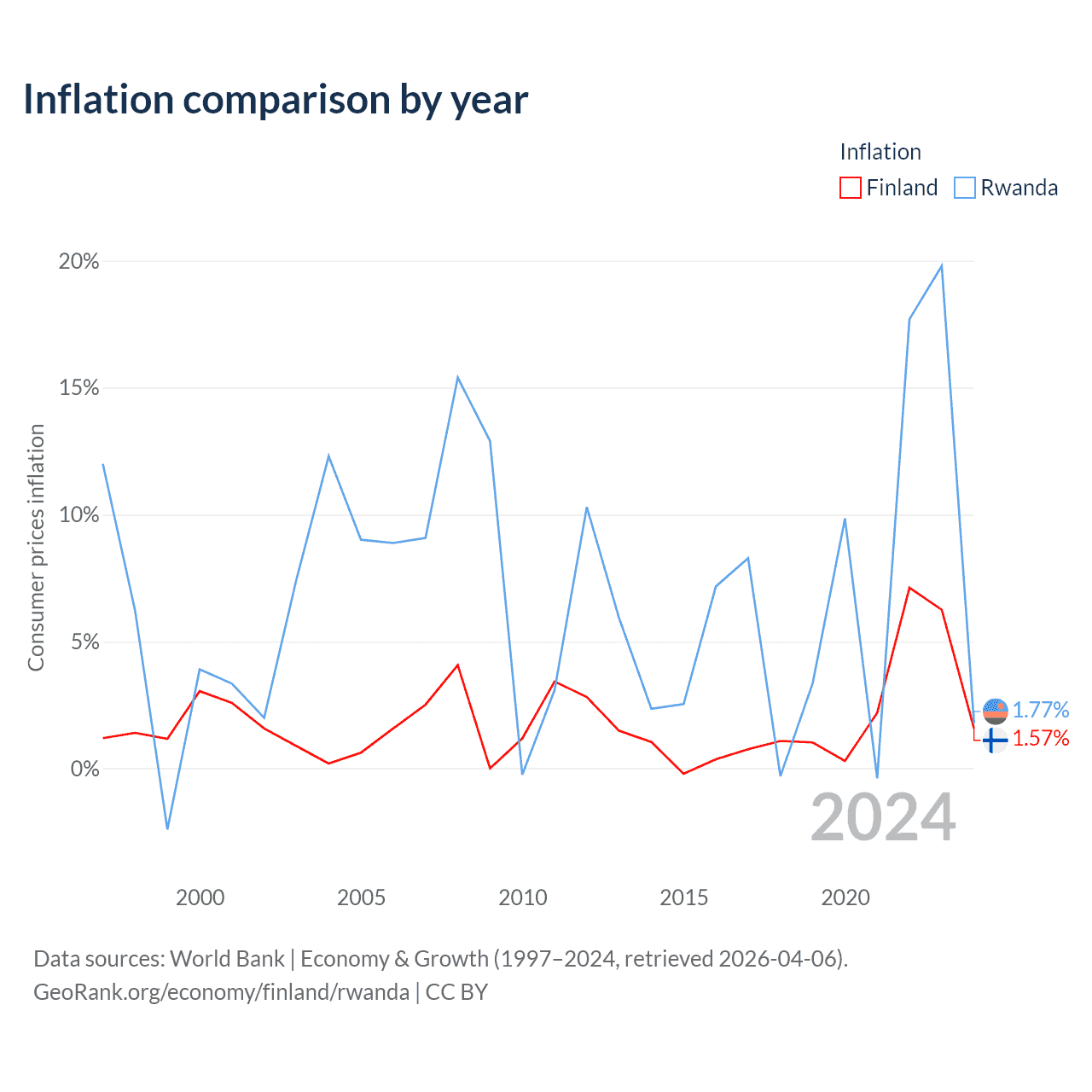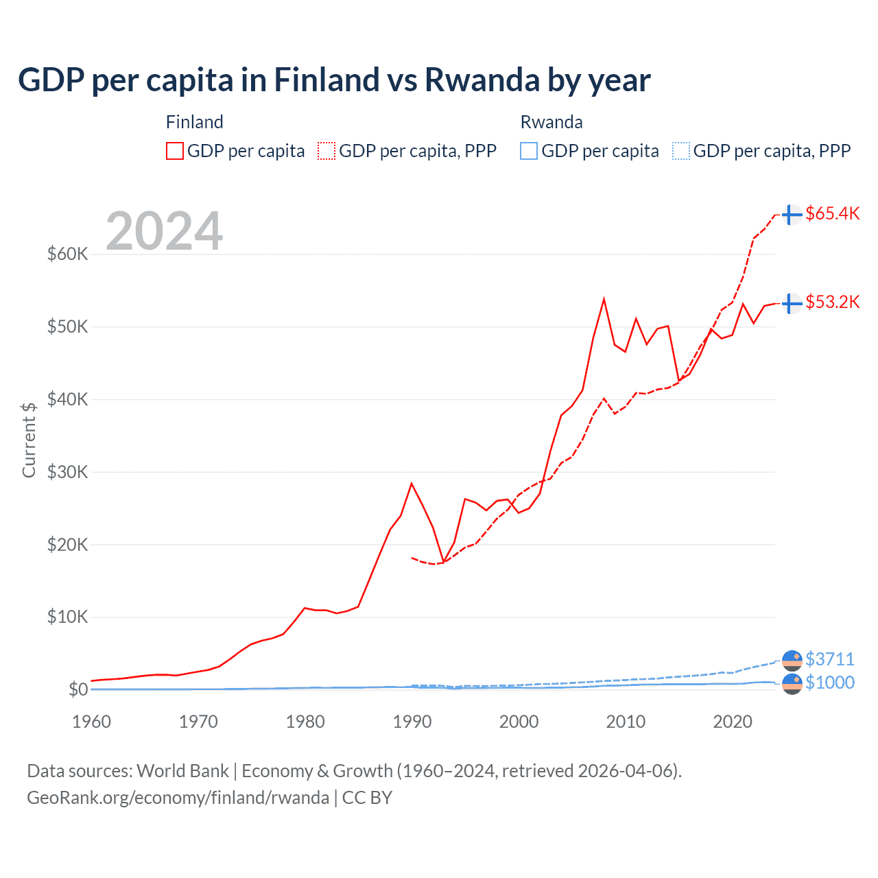 Finland has a GDP of $299B compared to $14.3B for Rwanda, ranking 47/197 and 144/197 by economy size, respectively.