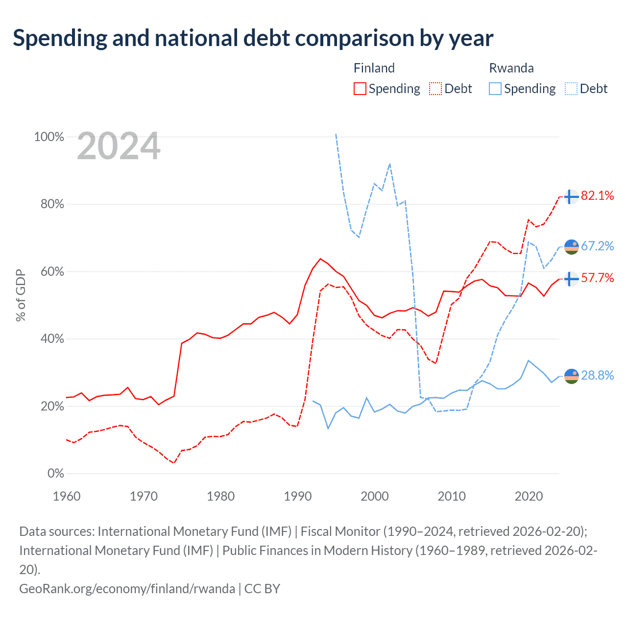 Finland has $245B in government debt (82.1% of GDP), compared to $9.58B (67.2% of GDP) in Rwanda.