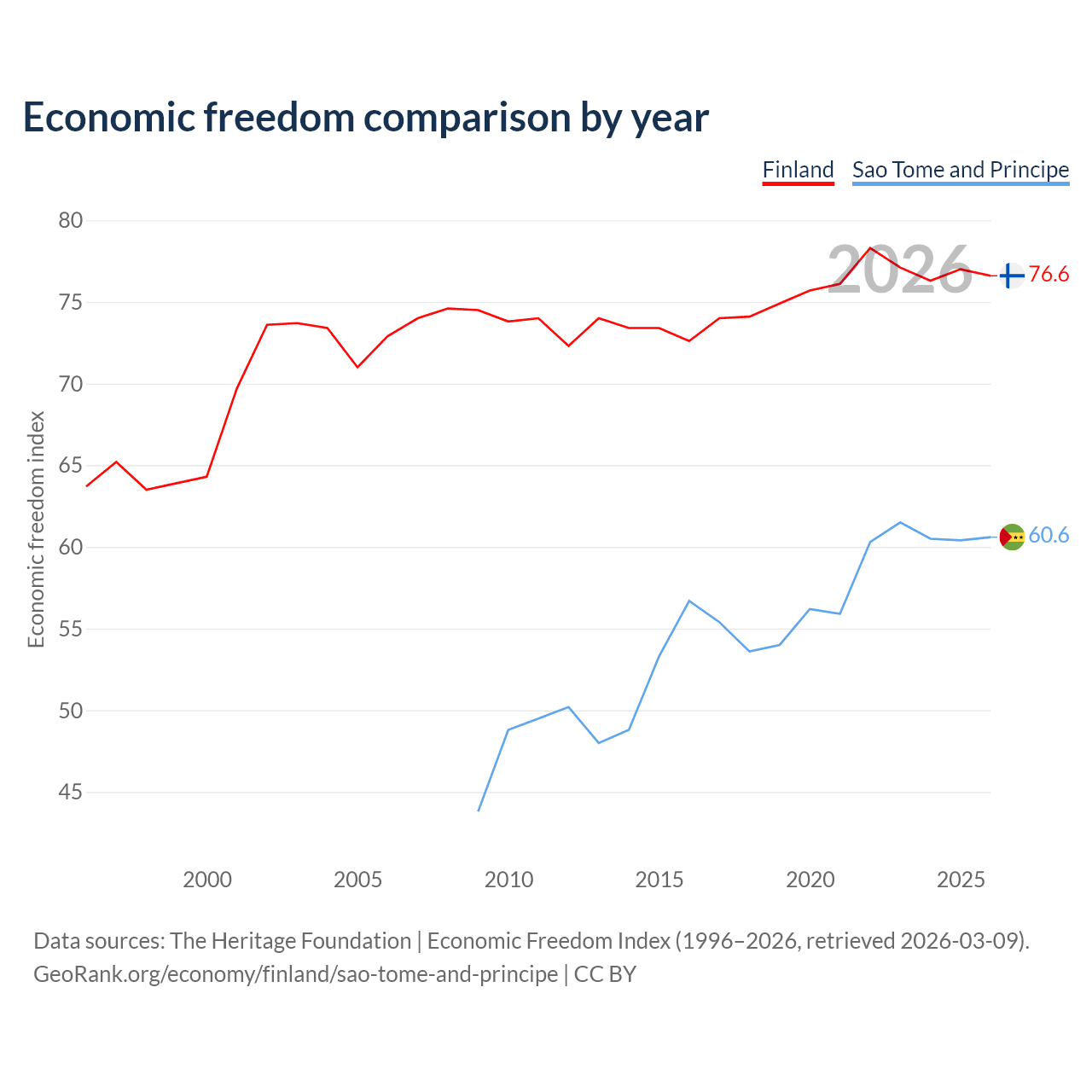 The Economic Freedom Index for Finland is 76.6, ranking 15/197, compared to 60.6 for Sao Tome and Principe, ranking 93/197. The chart above displays a comparison of annual changes in economic freedom indexes.
