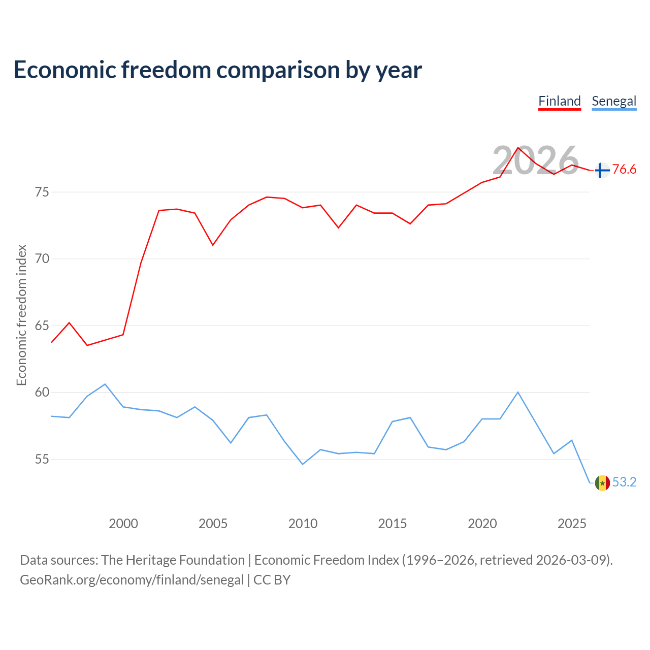 The Economic Freedom Index for Finland is 76.6, ranking 15/197, compared to 53.2 for Senegal, ranking 140/197. The chart above displays a comparison of annual changes in economic freedom indexes.