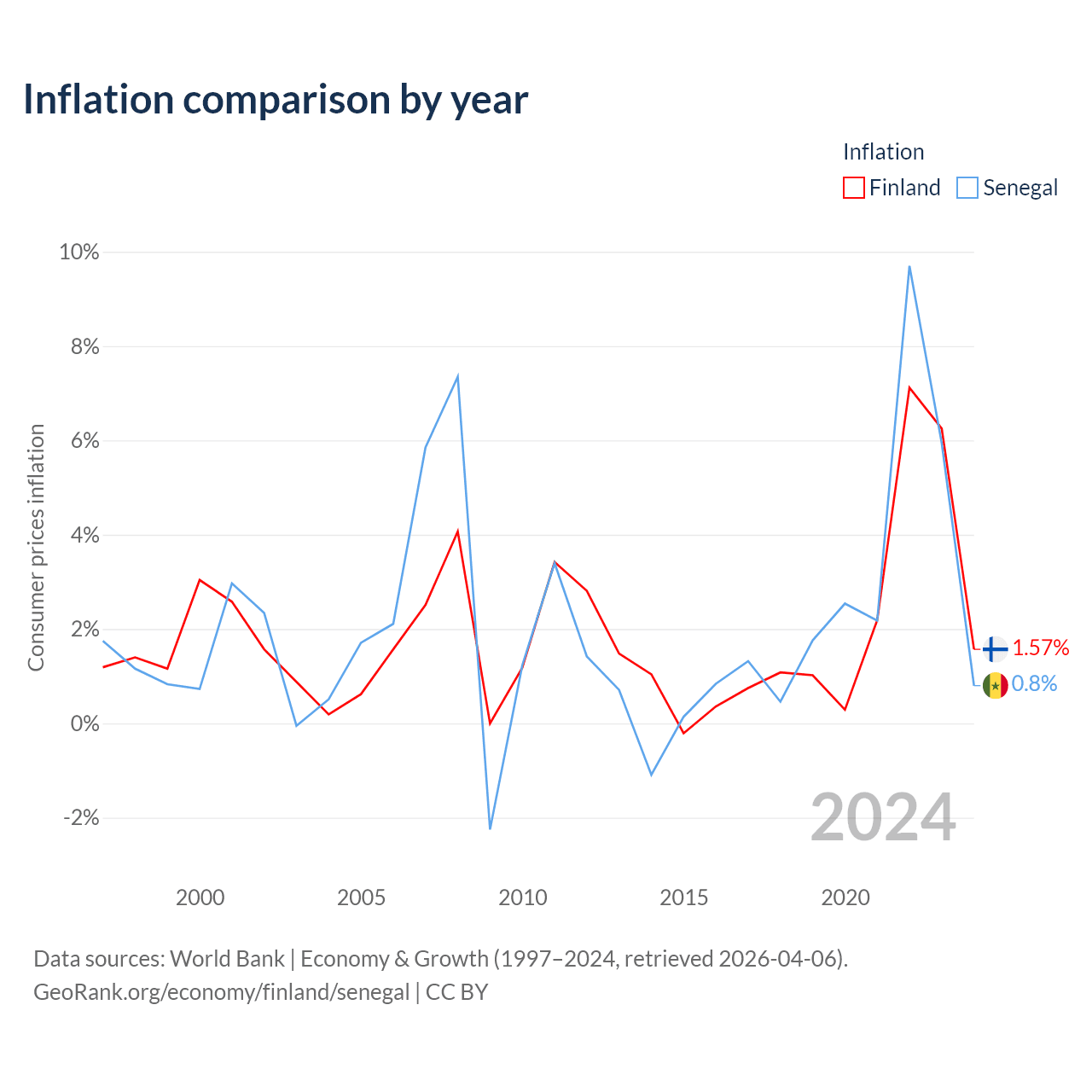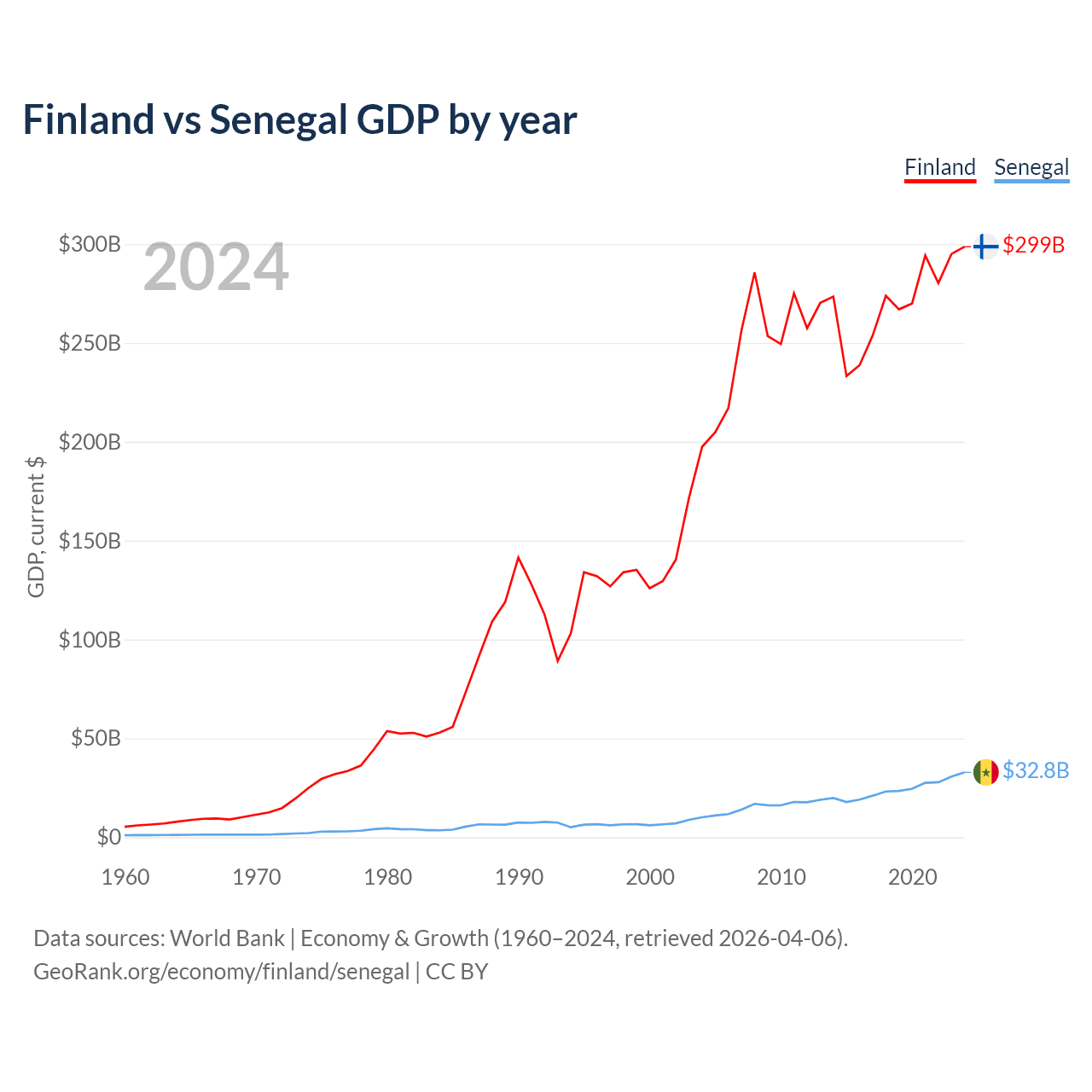 Finland has a GDP of $299B compared to $32.8B for Senegal, ranking 47/197 and 109/197 by economy size, respectively.