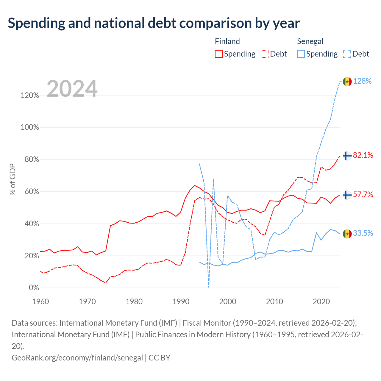 Finland has $245B in government debt (82.1% of GDP), compared to $42.1B (128.4% of GDP) in Senegal.