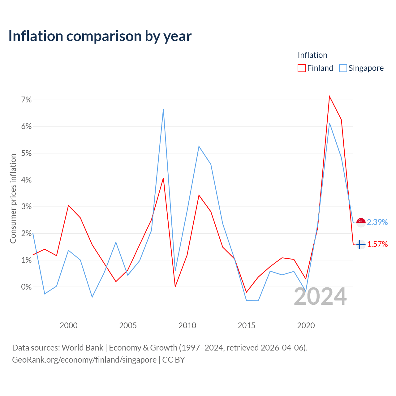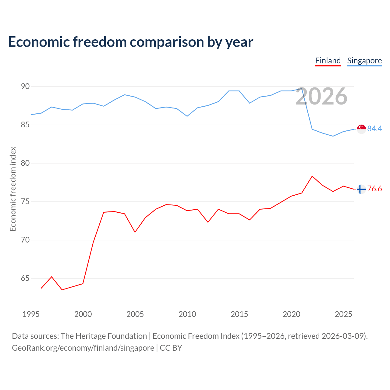 The Economic Freedom Index for Finland is 76.6, ranking 15/197, compared to 84.4 for Singapore, ranking 1/197. The chart above displays a comparison of annual changes in economic freedom indexes.