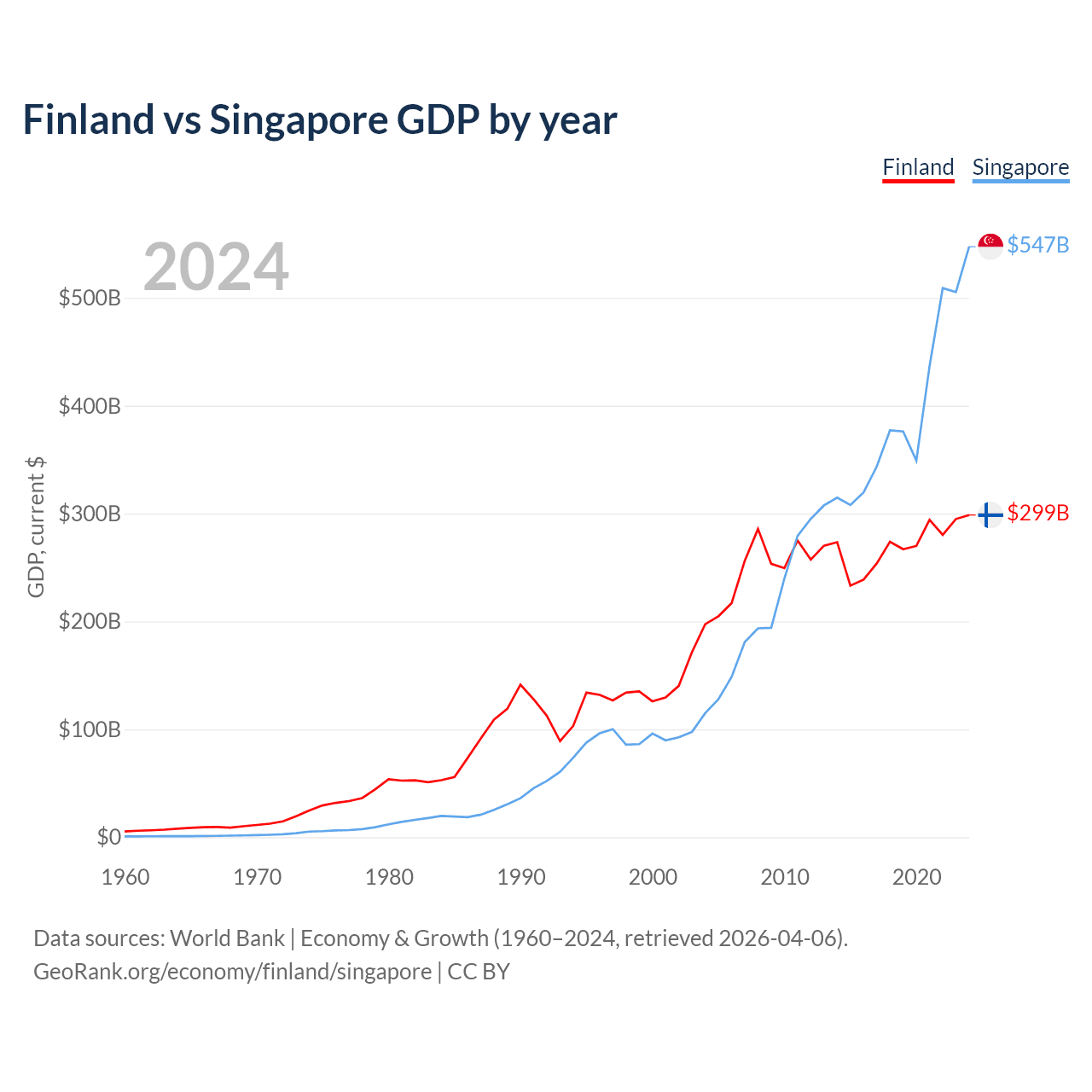 Finland has a GDP of $299B compared to $547B for Singapore, ranking 47/197 and 28/197 by economy size, respectively.