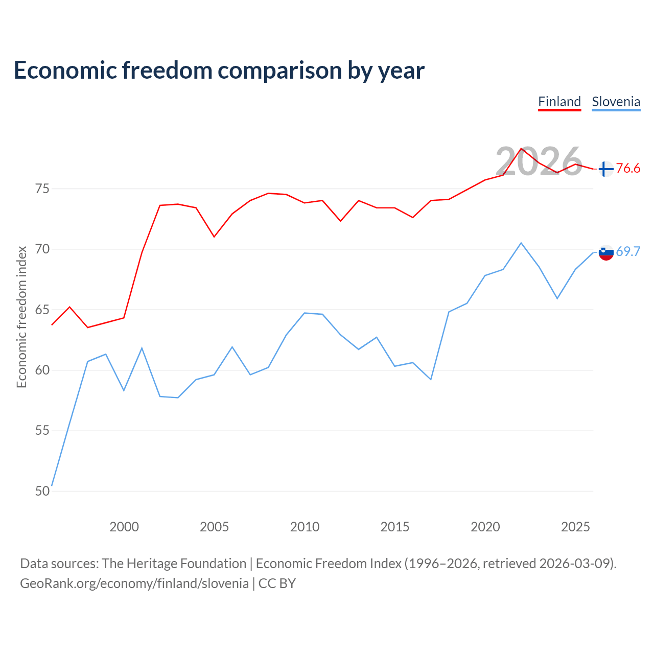 The Economic Freedom Index for Finland is 76.6, ranking 15/197, compared to 69.7 for Slovenia, ranking 40/197. The chart above displays a comparison of annual changes in economic freedom indexes.