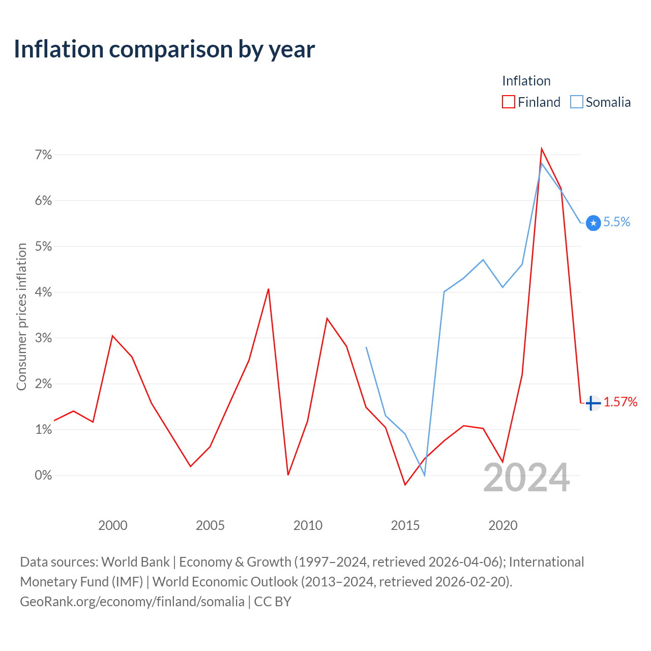 Finland has a GDP of $299B compared to $12B for Somalia, ranking 47/197 and 150/197 by economy size, respectively.