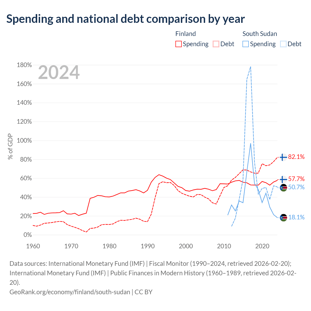 Finland has $245B in government debt (82.1% of GDP), compared to $7.04B (50.7% of GDP) in South Sudan.