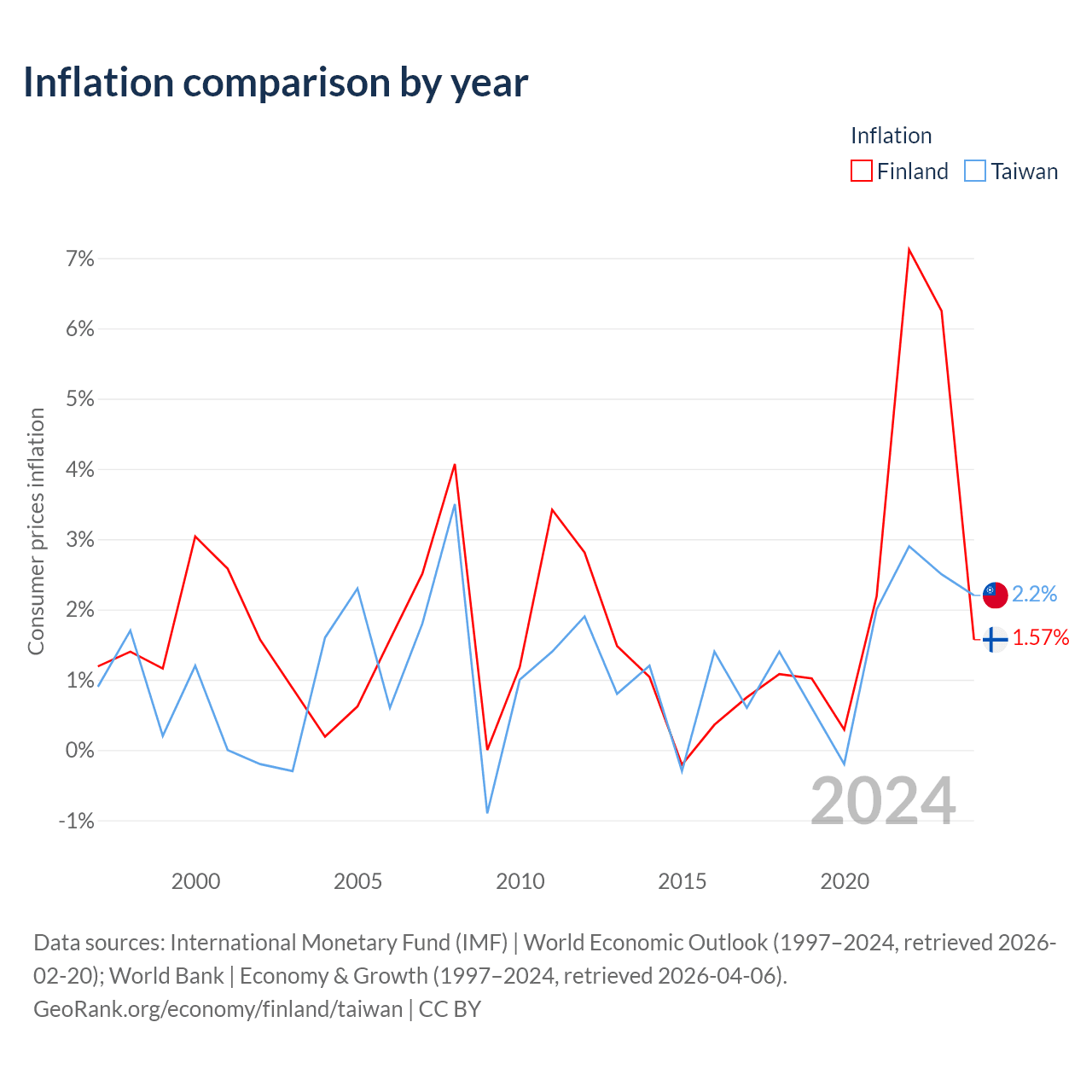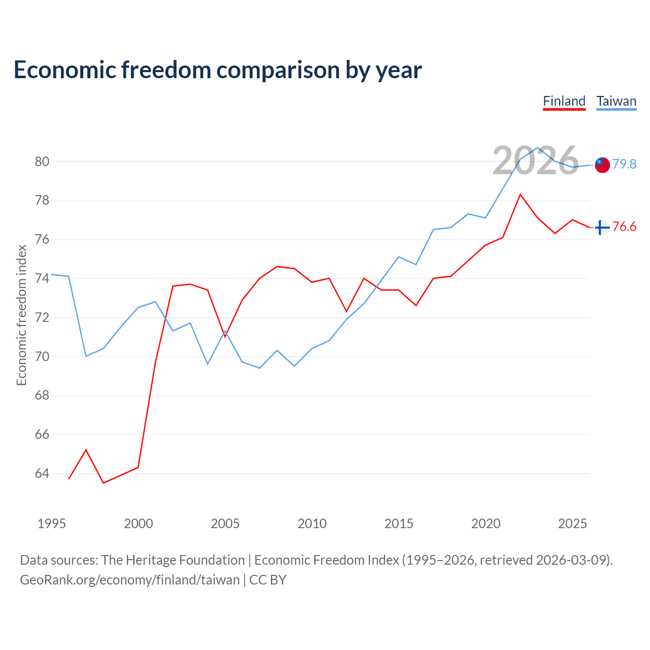The Economic Freedom Index for Finland is 76.6, ranking 15/197, compared to 79.8 for Taiwan, ranking 6/197. The chart above displays a comparison of annual changes in economic freedom indexes.