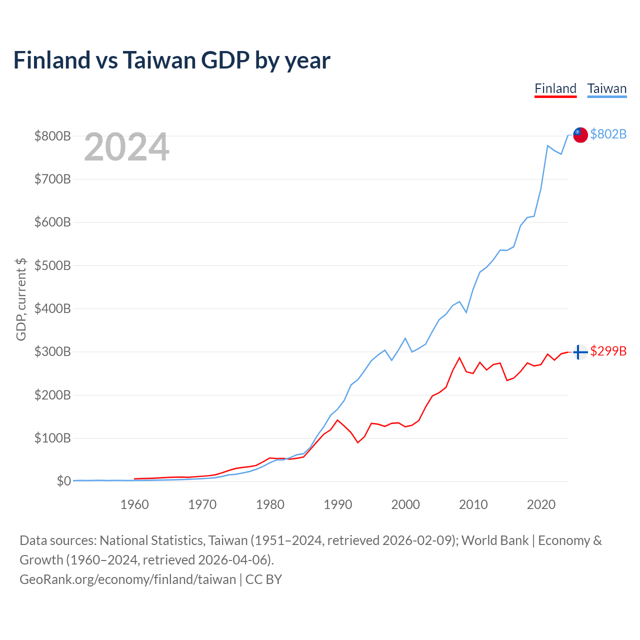 Finland has a GDP of $299B compared to $802B for Taiwan, ranking 47/197 and 22/197 by economy size, respectively.