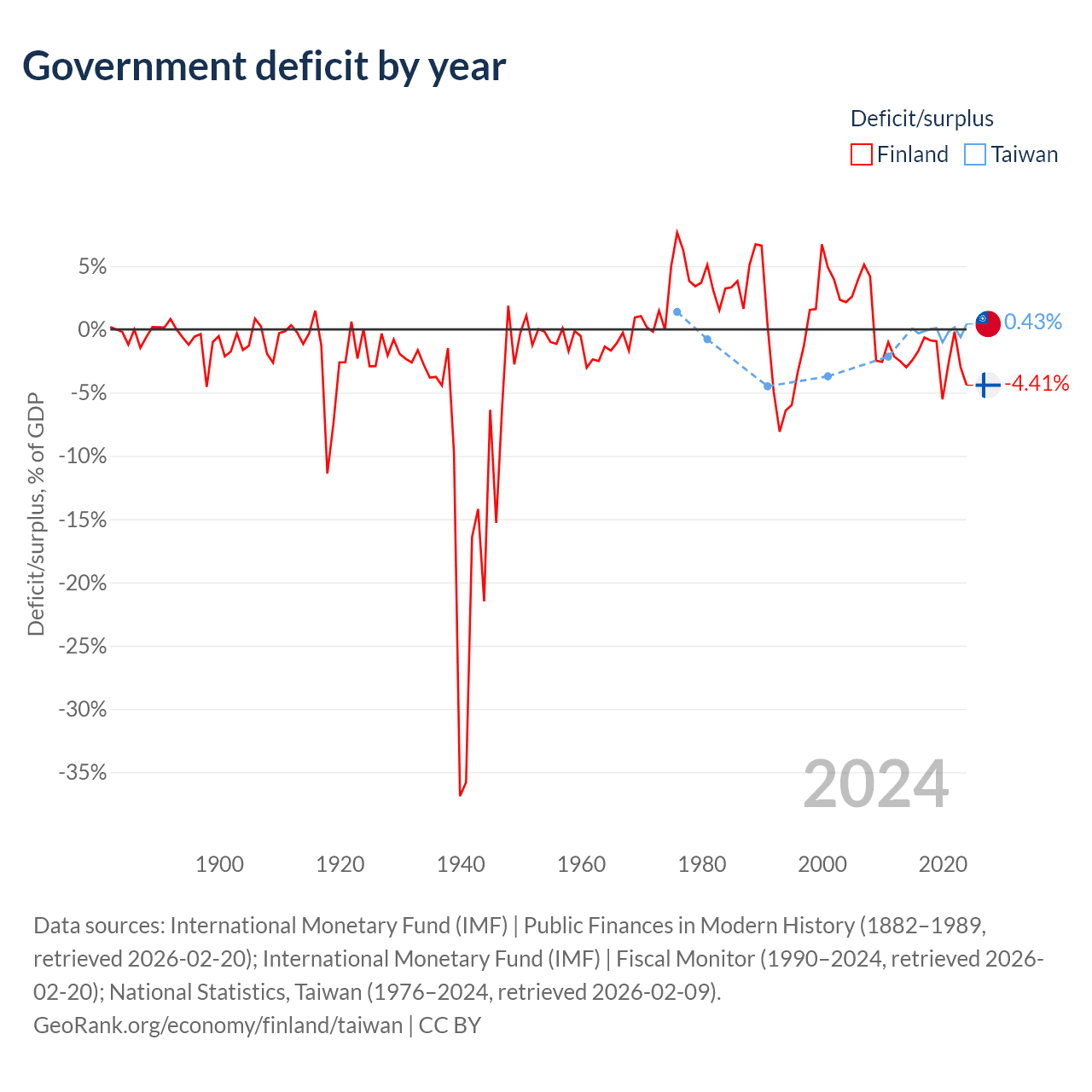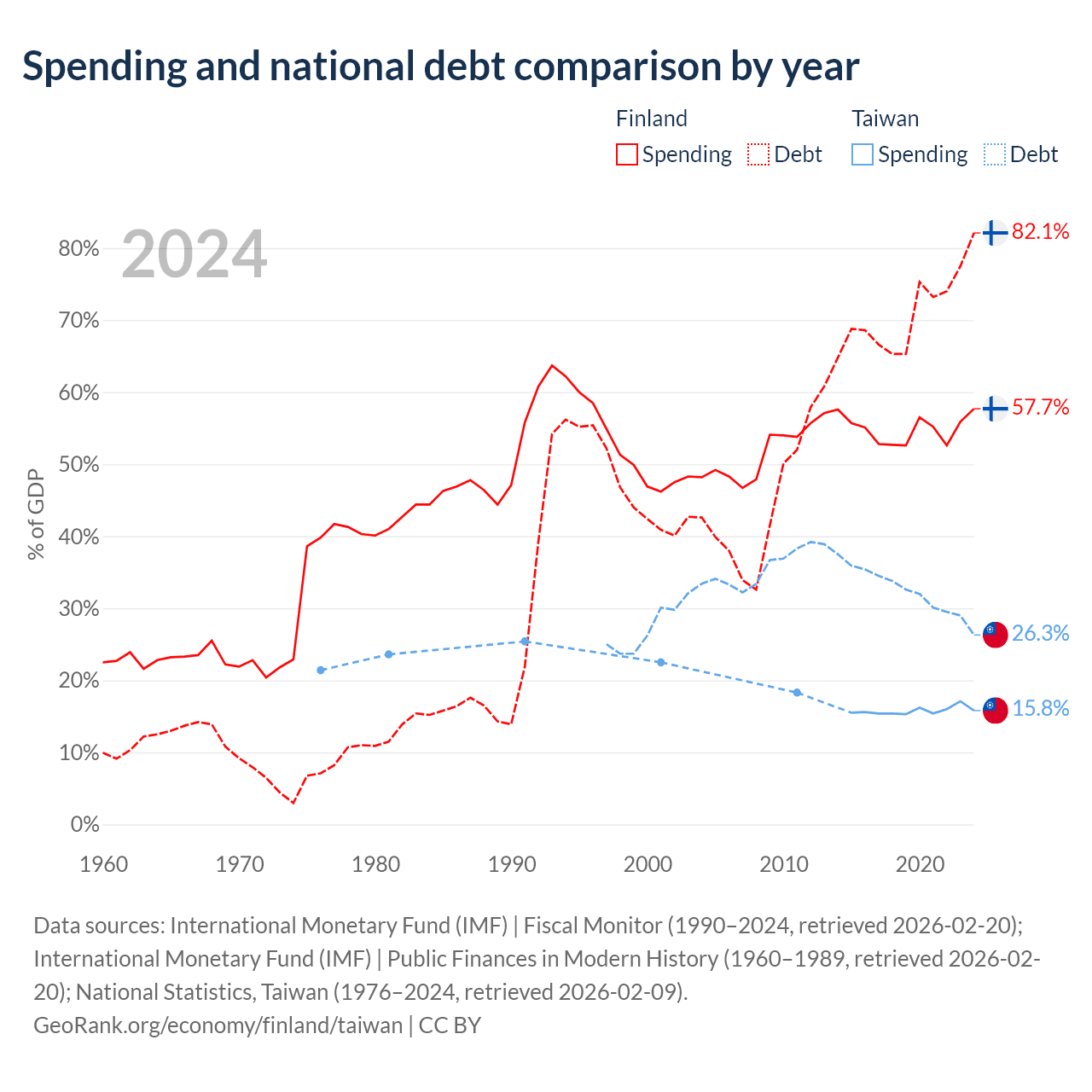 Finland has $245B in government debt (82.1% of GDP), compared to $211B (26.3% of GDP) in Taiwan.