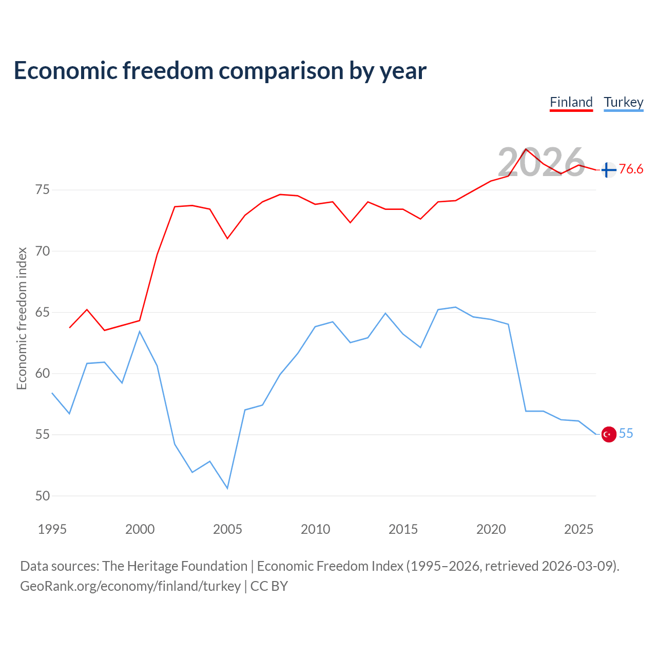 The Economic Freedom Index for Finland is 76.6, ranking 15/197, compared to 55 for Turkey, ranking 129/197. The chart above displays a comparison of annual changes in economic freedom indexes.