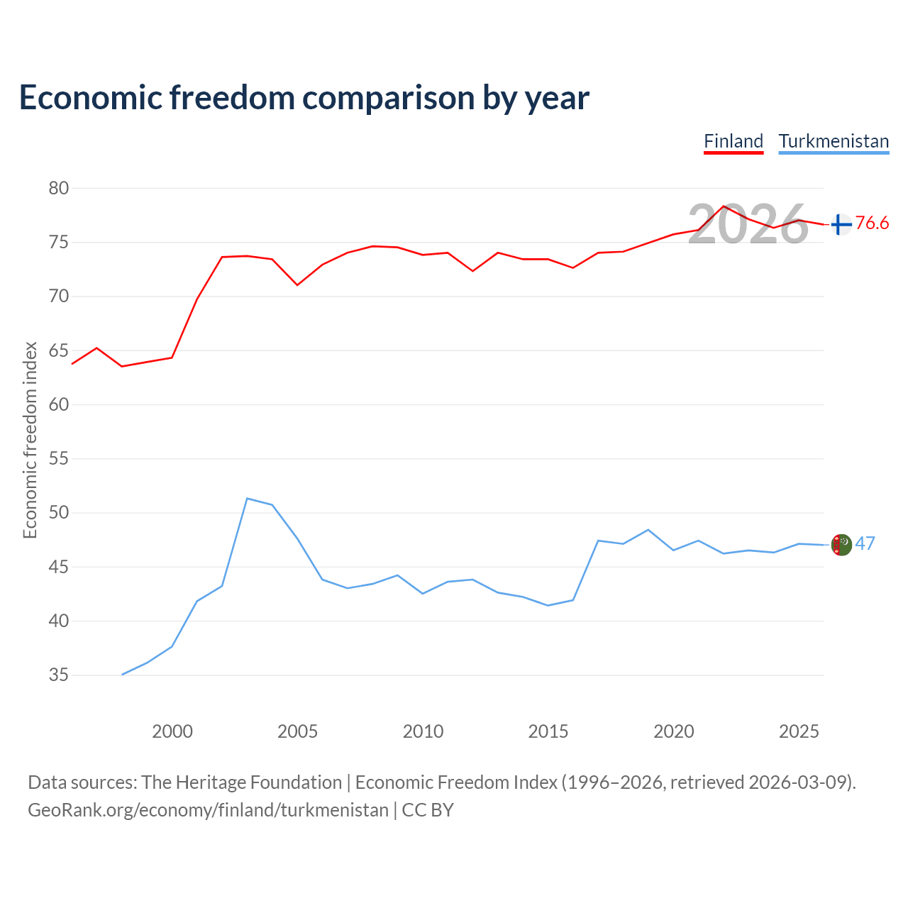 The Economic Freedom Index for Finland is 76.6, ranking 15/197, compared to 47 for Turkmenistan, ranking 177/197. The chart above displays a comparison of annual changes in economic freedom indexes.