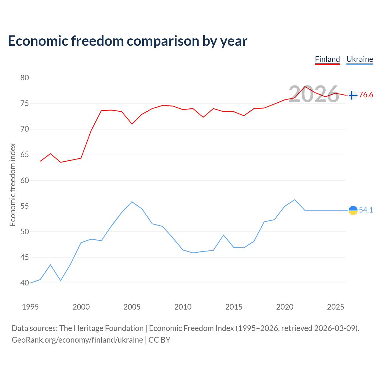 The Economic Freedom Index for Finland is 76.6, ranking 15/197, compared to 54.1 for Ukraine, ranking 135/197. The chart above displays a comparison of annual changes in economic freedom indexes.