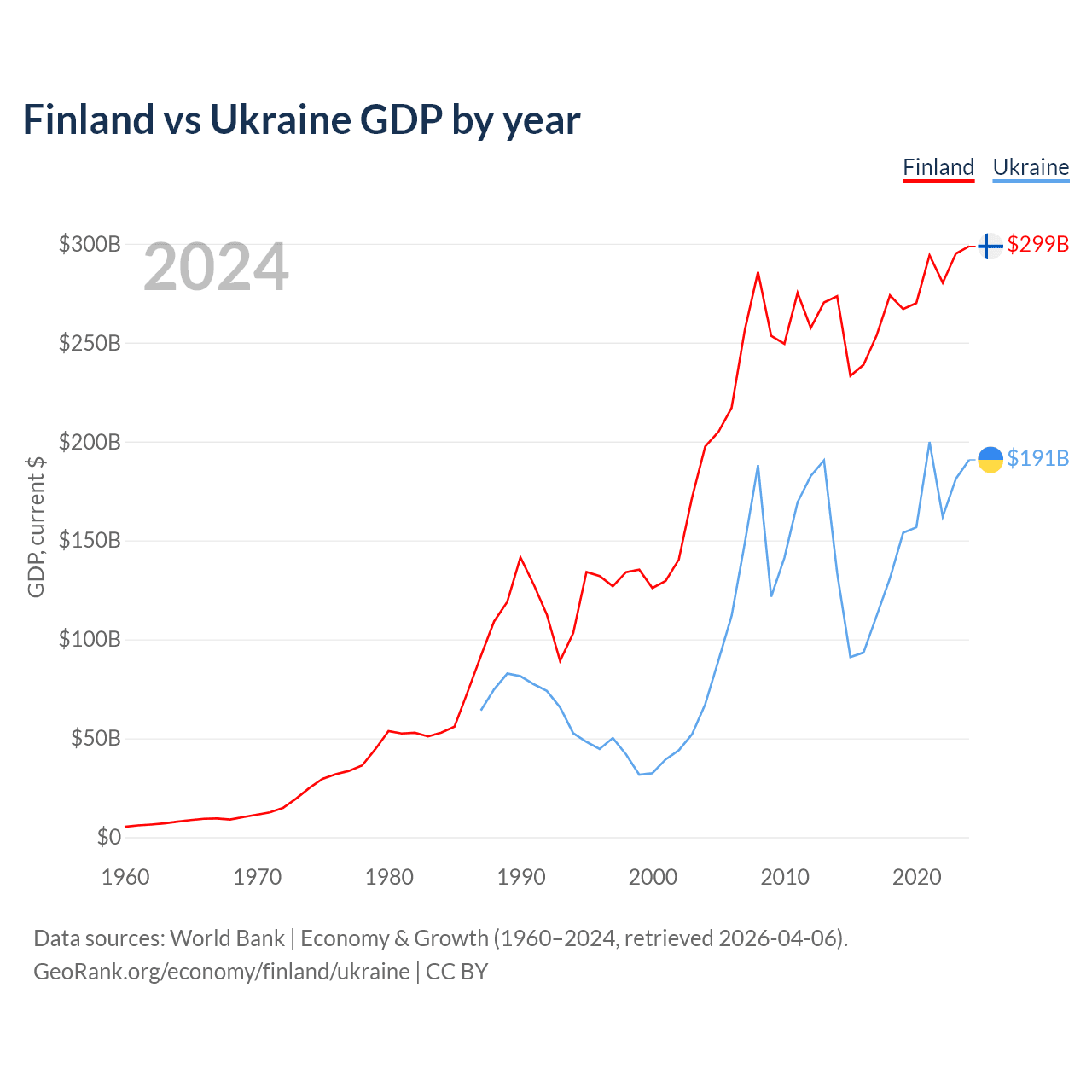 Finland has a GDP of $299B compared to $191B for Ukraine, ranking 47/197 and 57/197 by economy size, respectively.