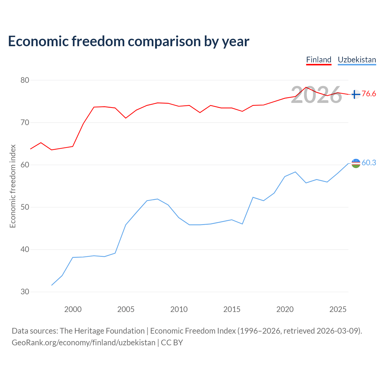 The Economic Freedom Index for Finland is 76.6, ranking 15/197, compared to 60.3 for Uzbekistan, ranking 94/197. The chart above displays a comparison of annual changes in economic freedom indexes.