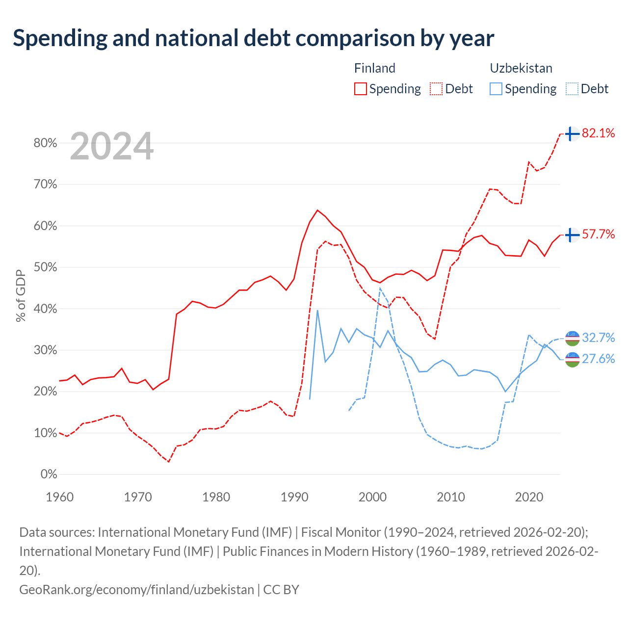 Finland has $245B in government debt (82.1% of GDP), compared to $37.5B (32.7% of GDP) in Uzbekistan.