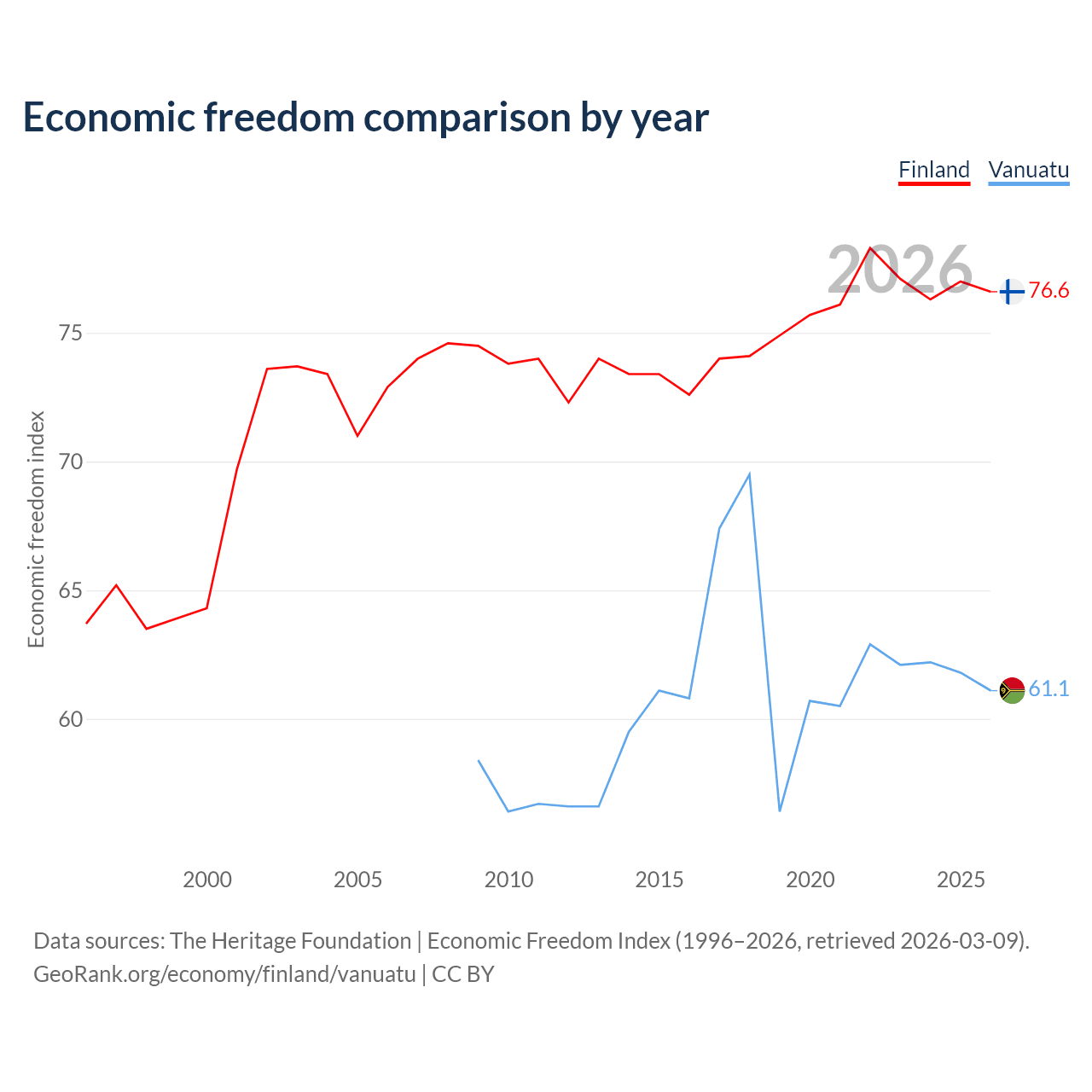 The Economic Freedom Index for Finland is 76.6, ranking 15/197, compared to 61.1 for Vanuatu, ranking 92/197. The chart above displays a comparison of annual changes in economic freedom indexes.