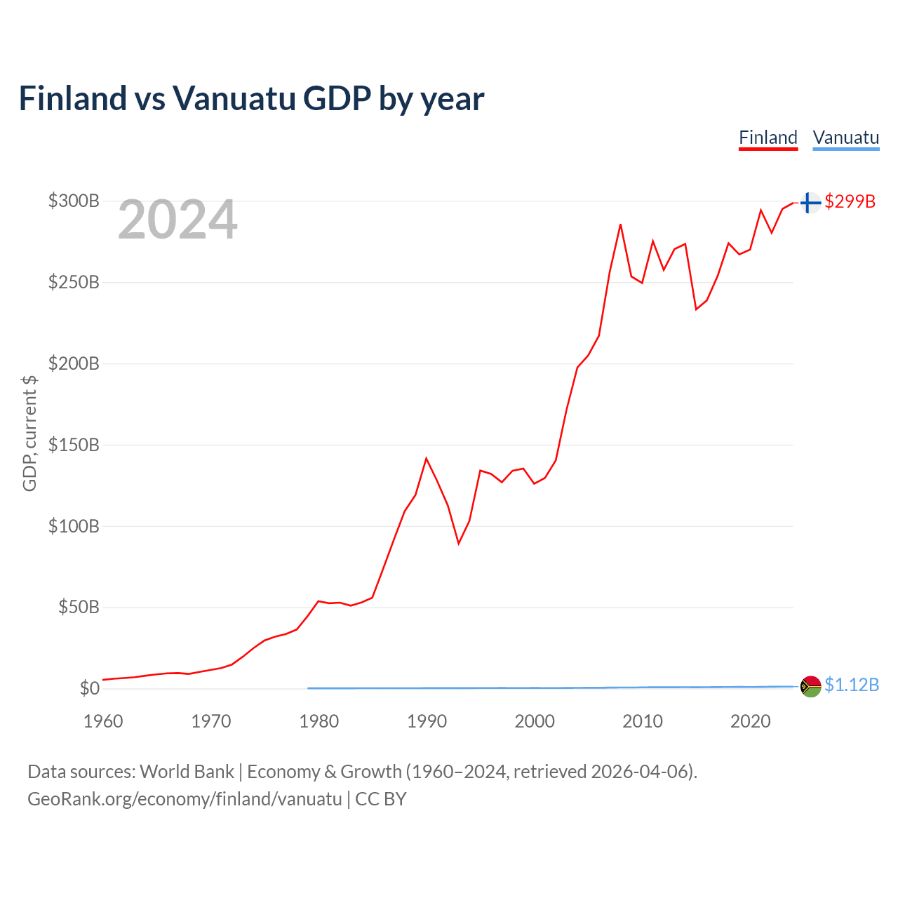 Finland has a GDP of $299B compared to $1.12B for Vanuatu, ranking 47/197 and 188/197 by economy size, respectively.