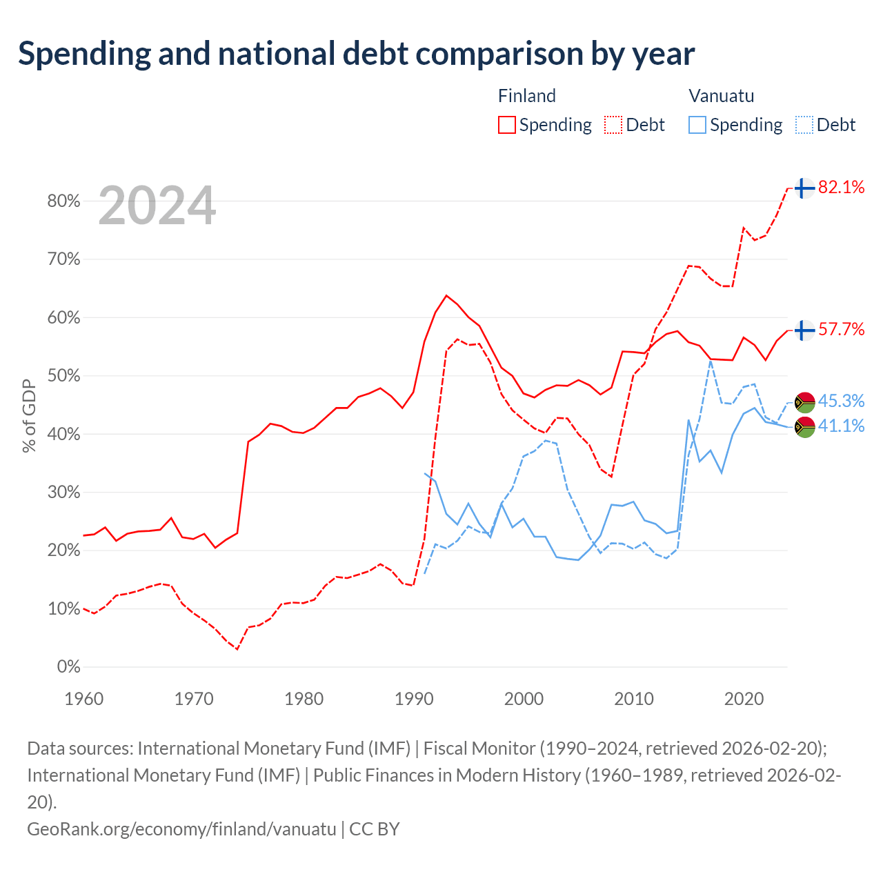 Finland has $245B in government debt (82.1% of GDP), compared to $507M (45.3% of GDP) in Vanuatu.