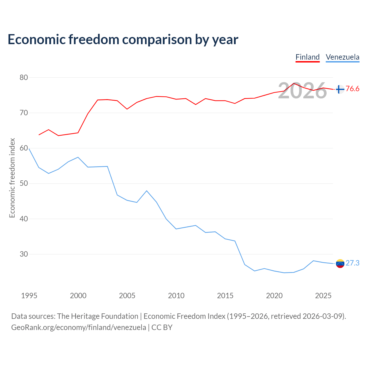 The Economic Freedom Index for Finland is 76.6, ranking 15/197, compared to 27.3 for Venezuela, ranking 194/197. The chart above displays a comparison of annual changes in economic freedom indexes.